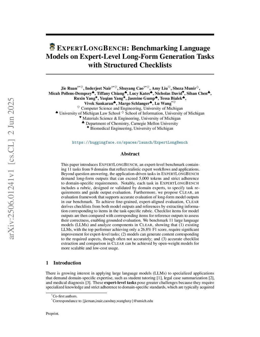 This paper introduces ExpertLongBench, an expert-level benchmark containing 11 tasks from 9 domains that reflect realistic expert workflows and applications. Beyond question answering, the application-driven tasks in ExpertLongBench demand long-form outputs that can exceed 5,000 tokens and strict adherence to domain-specific requirements. Notably, each task in ExpertLongBench includes a rubric, designed or validated by domain experts, to specify task requirements and guide output evaluation. Furthermore, we propose CLEAR, an evaluation framework that supports accurate evaluation of long-form model outputs in our benchmark. To achieve fine-grained, expert-aligned evaluation, CLEAR derives checklists from both model outputs and references by extracting information corresponding to items in the task-specific rubric. Checklist items of model outputs are then compared with corresponding items of reference outputs to assess their correctness, enabling grounded evaluation. We benchmark 13 popular large language models (LLMs) and analyze components in CLEAR, showing that (1) existing LLMs, with the top performer Gemini-2.5-Pro achieving only a 33.4 F1 score, require significant improvement for expert-level tasks; (2) models can generate content corresponding to the required aspects, but far from correct; and (3) accurate checklist extraction and comparison in CLEAR can be achieved by open-weight models for more scalable, reproducible, and low-cost usage.