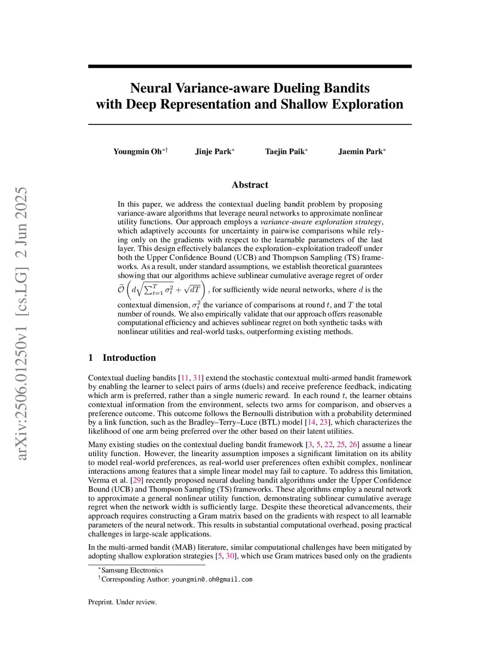 In this paper, we address the contextual dueling bandit problem by proposing variance-aware algorithms that leverage neural networks to approximate nonlinear utility functions. Our approach employs a \textit{variance-aware exploration strategy}, which adaptively accounts for uncertainty in pairwise comparisons while relying only on the gradients with respect to the learnable parameters of the last layer. This design effectively balances the exploration--exploitation tradeoff under both the Upper Confidence Bound (UCB) and Thompson Sampling (TS) frameworks. As a result, under standard assumptions, we establish theoretical guarantees showing that our algorithms achieve sublinear cumulative average regret of order for sufficiently wide neural networks, where $ d $ is the contextual dimension, $ \sigma_t^2 $ the variance of comparisons at round $ t $, and $ T $ the total number of rounds. We also empirically validate that our approach offers reasonable computational efficiency and achieves sublinear regret on both synthetic tasks with nonlinear utilities and real-world tasks, outperforming existing methods.