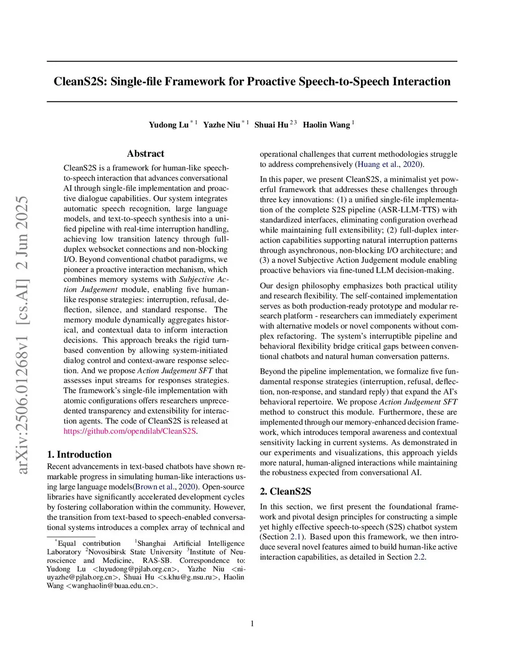 CleanS2S is a framework for human-like speech-to-speech interaction that advances conversational AI through single-file implementation and proactive dialogue capabilities. Our system integrates automatic speech recognition, large language models, and text-to-speech synthesis into a unified pipeline with real-time interruption handling, achieving low transition latency through full-duplex websocket connections and non-blocking I/O. Beyond conventional chatbot paradigms, we pioneer a proactive interaction mechanism, which combines memory systems with Subjective Action Judgement module, enabling five human-like response strategies: interruption, refusal, deflection, silence, and standard response. The memory module dynamically aggregates historical, and contextual data to inform interaction decisions. This approach breaks the rigid turn-based convention by allowing system-initiated dialog control and context-aware response selection. And we propose Action Judgement SFT that assesses input streams for responses strategies. The framework's single-file implementation with atomic configurations offers researchers unprecedented transparency and extensibility for interaction agents. The code of CleanS2S is released at \this https URL.