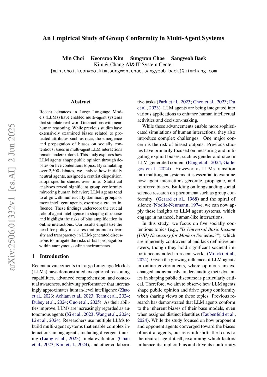 Recent advances in Large Language Models (LLMs) have enabled multi-agent systems that simulate real-world interactions with near-human reasoning. While previous studies have extensively examined biases related to protected attributes such as race, the emergence and propagation of biases on socially contentious issues in multi-agent LLM interactions remain underexplored. This study explores how LLM agents shape public opinion through debates on five contentious topics. By simulating over 2,500 debates, we analyze how initially neutral agents, assigned a centrist disposition, adopt specific stances over time. Statistical analyses reveal significant group conformity mirroring human behavior; LLM agents tend to align with numerically dominant groups or more intelligent agents, exerting a greater influence. These findings underscore the crucial role of agent intelligence in shaping discourse and highlight the risks of bias amplification in online interactions. Our results emphasize the need for policy measures that promote diversity and transparency in LLM-generated discussions to mitigate the risks of bias propagation within anonymous online environments.