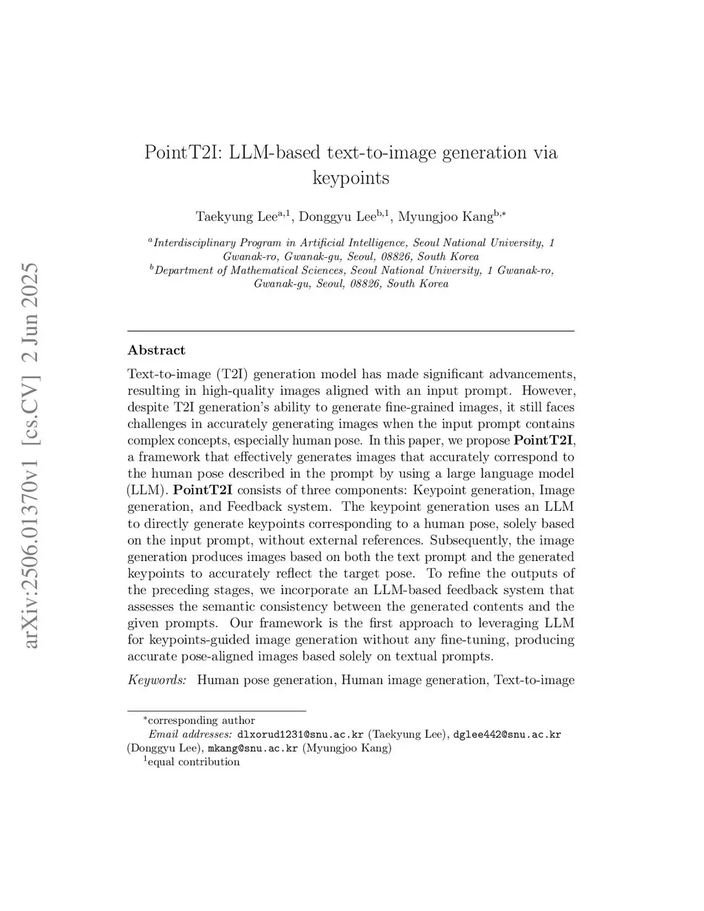 Text-to-image (T2I) generation model has made significant advancements, resulting in high-quality images aligned with an input prompt. However, despite T2I generation's ability to generate fine-grained images, it still faces challenges in accurately generating images when the input prompt contains complex concepts, especially human pose. In this paper, we propose PointT2I, a framework that effectively generates images that accurately correspond to the human pose described in the prompt by using a large language model (LLM). PointT2I consists of three components: Keypoint generation, Image generation, and Feedback system. The keypoint generation uses an LLM to directly generate keypoints corresponding to a human pose, solely based on the input prompt, without external references. Subsequently, the image generation produces images based on both the text prompt and the generated keypoints to accurately reflect the target pose. To refine the outputs of the preceding stages, we incorporate an LLM-based feedback system that assesses the semantic consistency between the generated contents and the given prompts. Our framework is the first approach to leveraging LLM for keypoints-guided image generation without any fine-tuning, producing accurate pose-aligned images based solely on textual prompts.