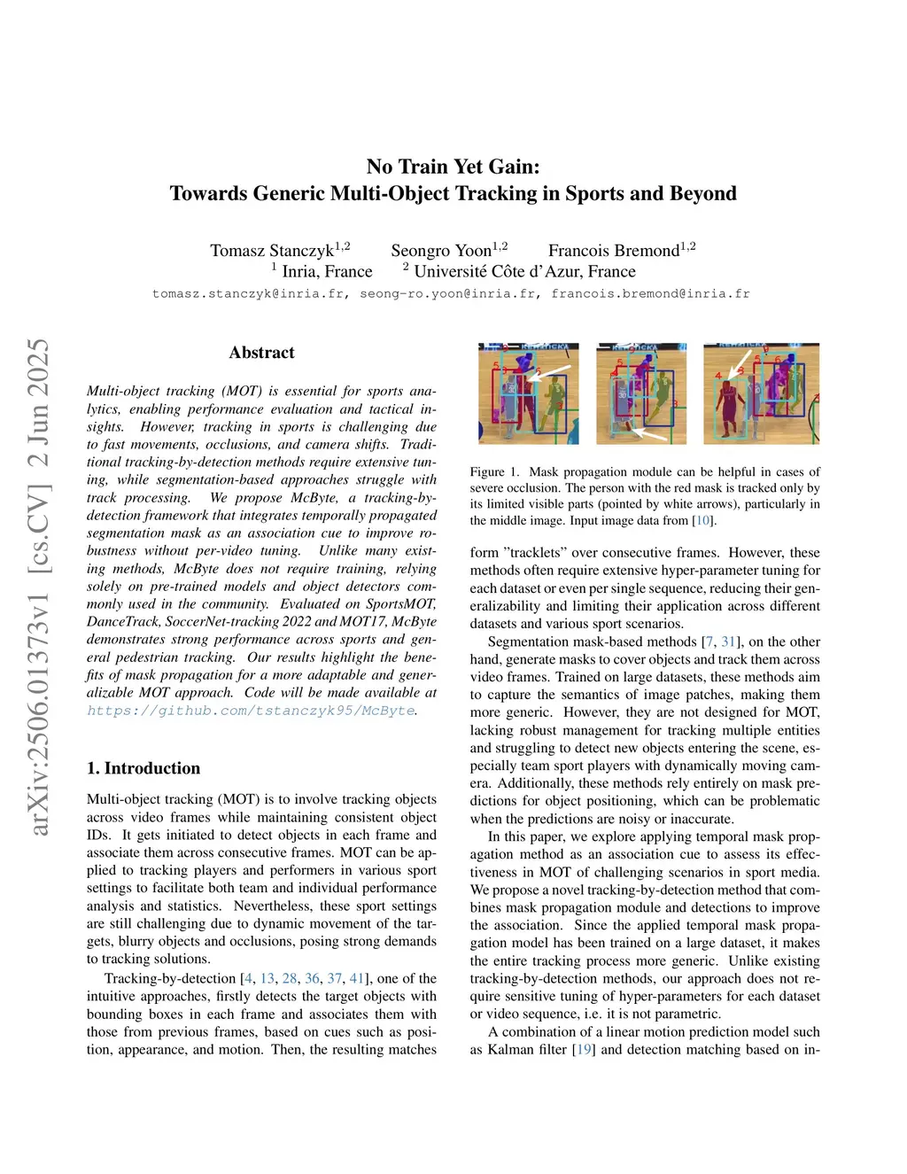 Multi-object tracking (MOT) is essential for sports analytics, enabling performance evaluation and tactical insights. However, tracking in sports is challenging due to fast movements, occlusions, and camera shifts. Traditional tracking-by-detection methods require extensive tuning, while segmentation-based approaches struggle with track processing. We propose McByte, a tracking-by-detection framework that integrates temporally propagated segmentation mask as an association cue to improve robustness without per-video tuning. Unlike many existing methods, McByte does not require training, relying solely on pre-trained models and object detectors commonly used in the community. Evaluated on SportsMOT, DanceTrack, SoccerNet-tracking 2022 and MOT17, McByte demonstrates strong performance across sports and general pedestrian tracking. Our results highlight the benefits of mask propagation for a more adaptable and generalizable MOT approach. Code will be made available atthis https URL.