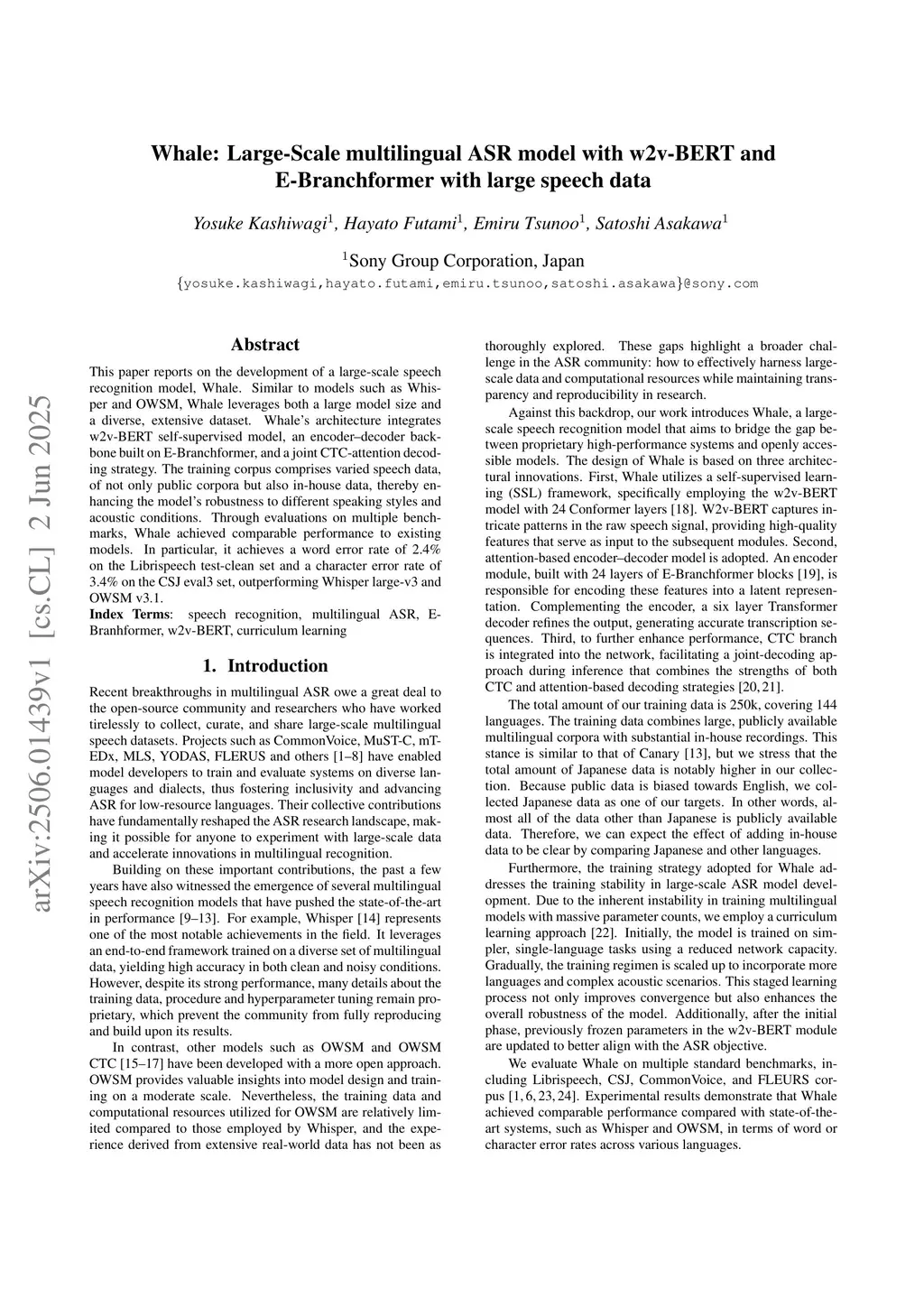 Whale: Large-Scale multilingual ASR model with w2v-BERT and E-Branchformer with large speech data