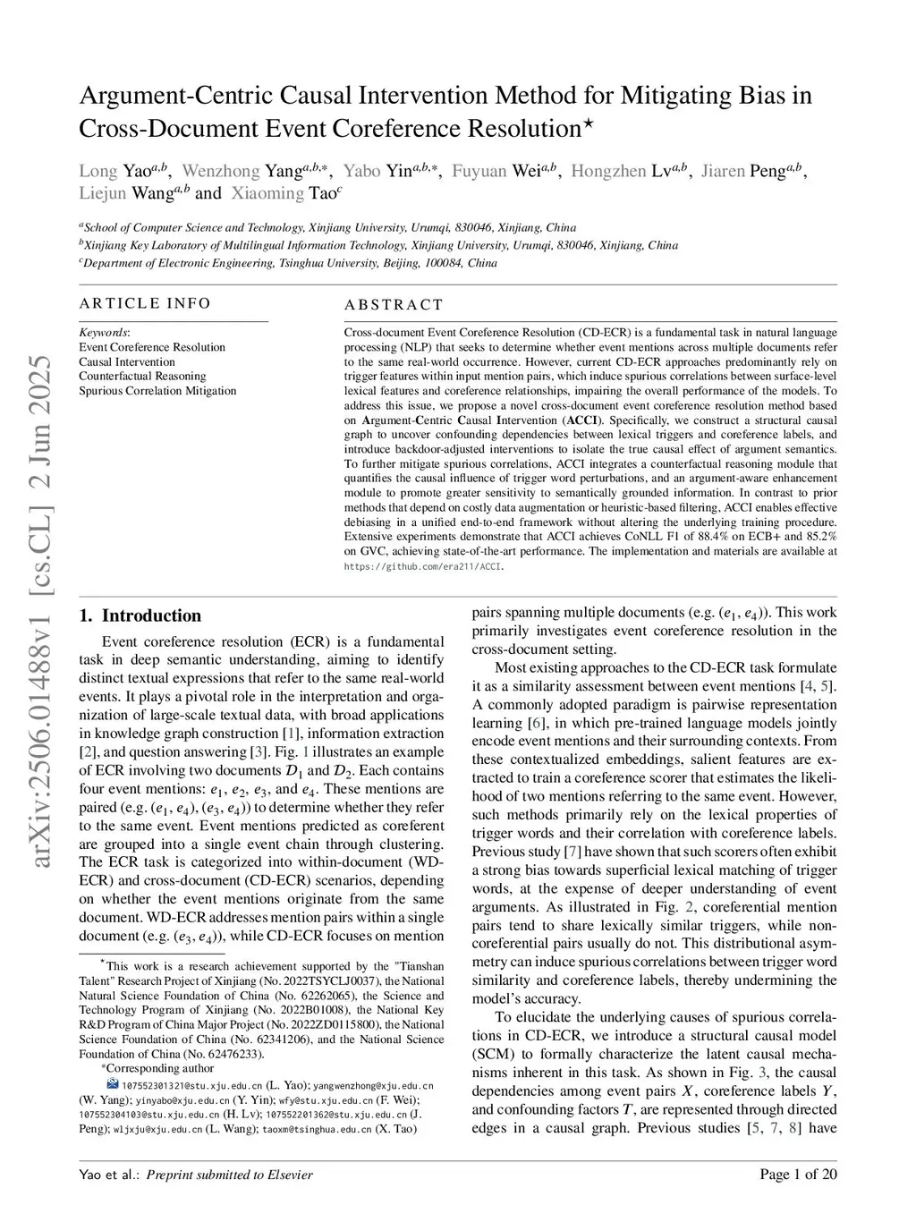 Cross-document Event Coreference Resolution (CD-ECR) is a fundamental task in natural language processing (NLP) that seeks to determine whether event mentions across multiple documents refer to the same real-world occurrence. However, current CD-ECR approaches predominantly rely on trigger features within input mention pairs, which induce spurious correlations between surface-level lexical features and coreference relationships, impairing the overall performance of the models. To address this issue, we propose a novel cross-document event coreference resolution method based on Argument-Centric Causal Intervention (ACCI). Specifically, we construct a structural causal graph to uncover confounding dependencies between lexical triggers and coreference labels, and introduce backdoor-adjusted interventions to isolate the true causal effect of argument semantics. To further mitigate spurious correlations, ACCI integrates a counterfactual reasoning module that quantifies the causal influence of trigger word perturbations, and an argument-aware enhancement module to promote greater sensitivity to semantically grounded information. In contrast to prior methods that depend on costly data augmentation or heuristic-based filtering, ACCI enables effective debiasing in a unified end-to-end framework without altering the underlying training procedure. Extensive experiments demonstrate that ACCI achieves CoNLL F1 of 88.4% on ECB+ and 85.2% on GVC, achieving state-of-the-art performance. The implementation and materials are available atthis https URL.