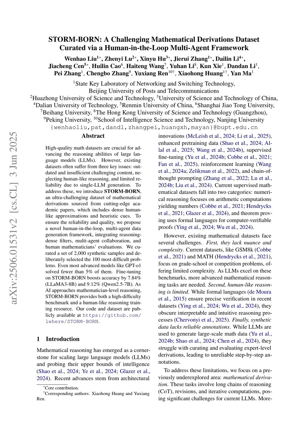 High-quality math datasets are crucial for advancing the reasoning abilities of large language models (LLMs). However, existing datasets often suffer from three key issues: outdated and insufficient challenging content, neglecting human-like reasoning, and limited reliability due to single-LLM generation. To address these, we introduce , an ultra-challenging dataset of mathematical derivations sourced from cutting-edge academic papers, which includes dense human-like approximations and heuristic cues. To ensure the reliability and quality, we propose a novel human-in-the-loop, multi-agent data generation framework, integrating reasoning-dense filters, multi-agent collaboration, and human mathematicians' evaluations. We curated a set of 2,000 synthetic samples and deliberately selected the 100 most difficult problems. Even most advanced models like GPT-o1 solved fewer than of them. Fine-tuning on STORM-BORN boosts accuracy by (LLaMA3-8B) and (Qwen2.5-7B). As AI approaches mathematician-level reasoning, STORM-BORN provides both a high-difficulty benchmark and a human-like reasoning training resource. Our code and dataset are publicly available at this https URL.