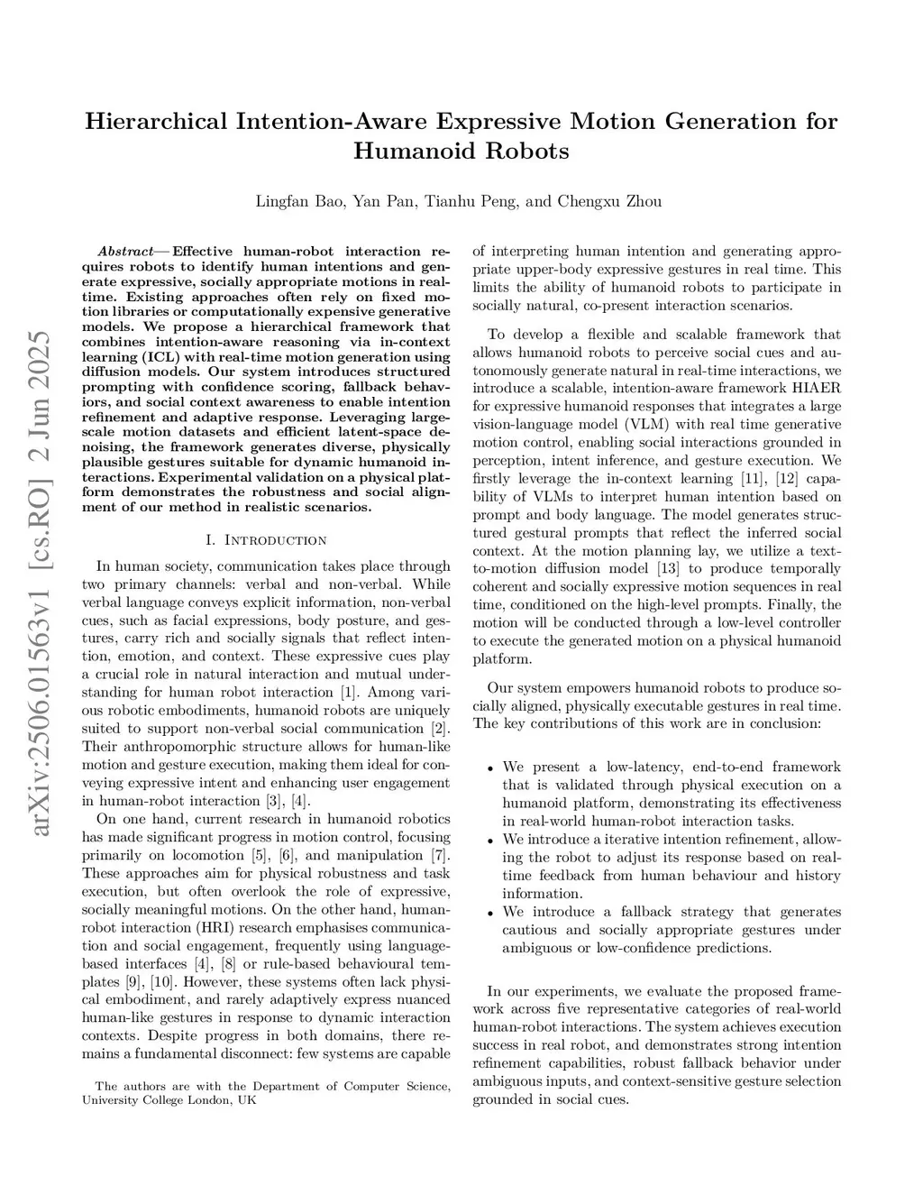 Hierarchical Intention-Aware Expressive Motion Generation for Humanoid Robots