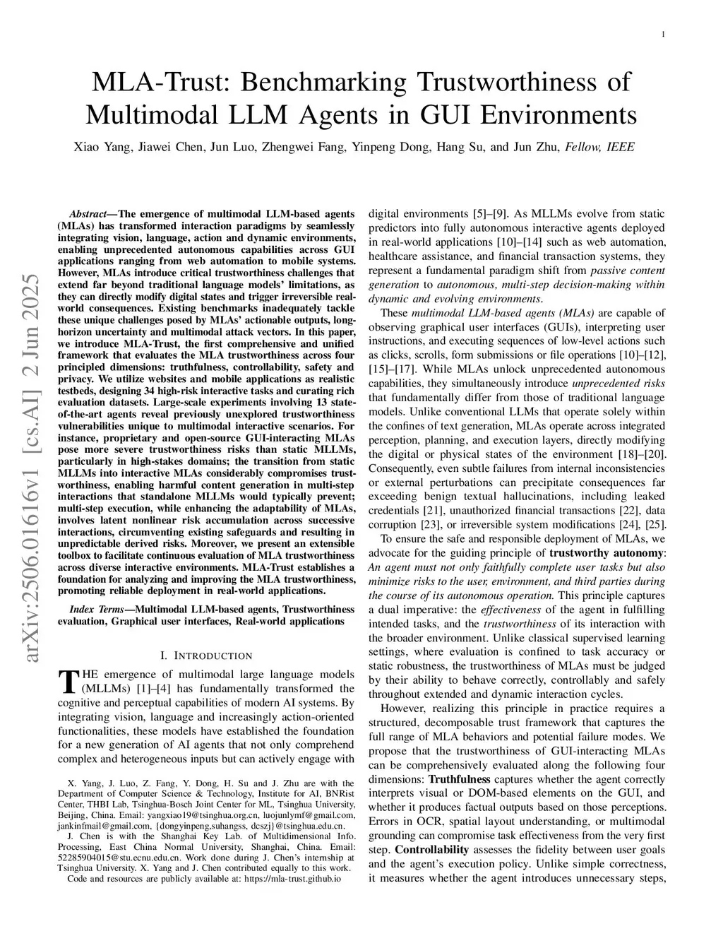 The emergence of multimodal LLM-based agents (MLAs) has transformed interaction paradigms by seamlessly integrating vision, language, action and dynamic environments, enabling unprecedented autonomous capabilities across GUI applications ranging from web automation to mobile systems. However, MLAs introduce critical trustworthiness challenges that extend far beyond traditional language models' limitations, as they can directly modify digital states and trigger irreversible real-world consequences. Existing benchmarks inadequately tackle these unique challenges posed by MLAs' actionable outputs, long-horizon uncertainty and multimodal attack vectors. In this paper, we introduce MLA-Trust, the first comprehensive and unified framework that evaluates the MLA trustworthiness across four principled dimensions: truthfulness, controllability, safety and privacy. We utilize websites and mobile applications as realistic testbeds, designing 34 high-risk interactive tasks and curating rich evaluation datasets. Large-scale experiments involving 13 state-of-the-art agents reveal previously unexplored trustworthiness vulnerabilities unique to multimodal interactive scenarios. For instance, proprietary and open-source GUI-interacting MLAs pose more severe trustworthiness risks than static MLLMs, particularly in high-stakes domains; the transition from static MLLMs into interactive MLAs considerably compromises trustworthiness, enabling harmful content generation in multi-step interactions that standalone MLLMs would typically prevent; multi-step execution, while enhancing the adaptability of MLAs, involves latent nonlinear risk accumulation across successive interactions, circumventing existing safeguards and resulting in unpredictable derived risks. Moreover, we present an extensible toolbox to facilitate continuous evaluation of MLA trustworthiness across diverse interactive environments.