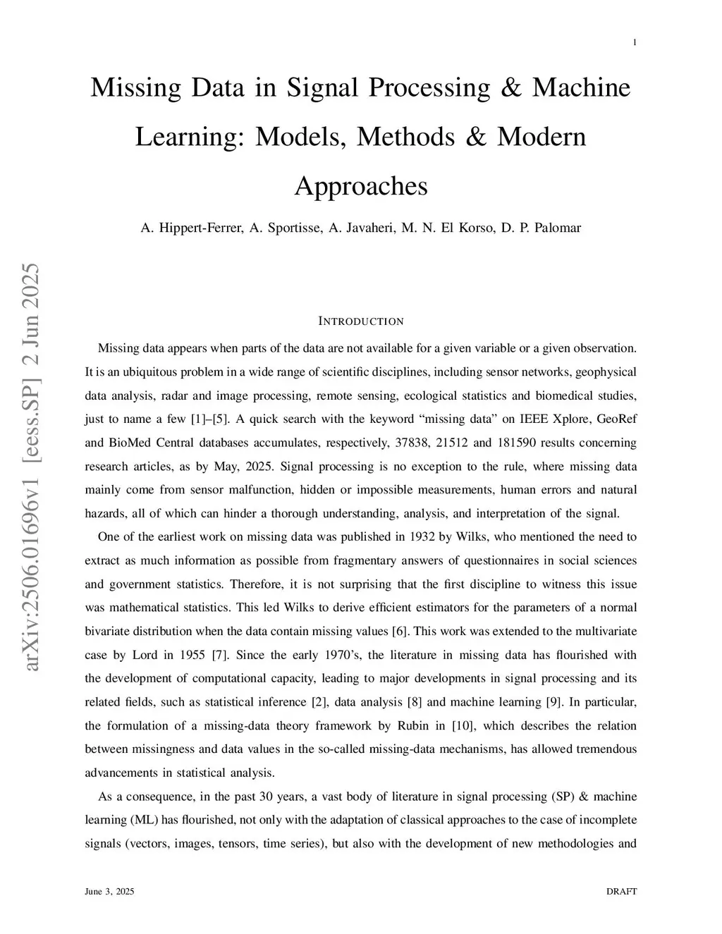 Missing Data in Signal Processing and Machine Learning: Models, Methods and Modern Approaches