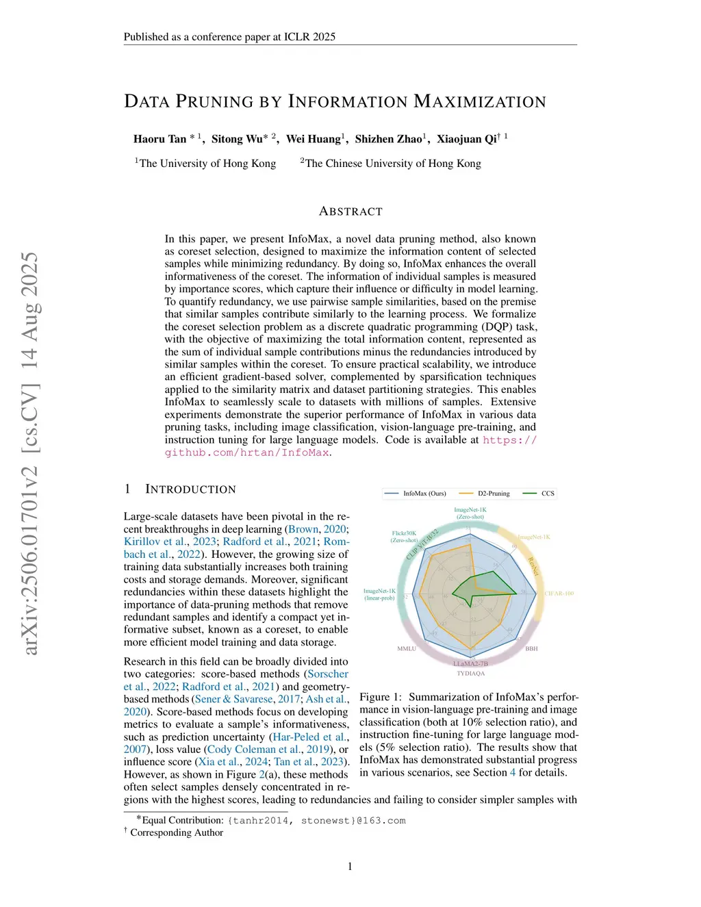 In this paper, we present InfoMax, a novel data pruning method, also known as coreset selection, designed to maximize the information content of selected samples while minimizing redundancy. By doing so, InfoMax enhances the overall informativeness of the coreset. The information of individual samples is measured by importance scores, which capture their influence or difficulty in model learning. To quantify redundancy, we use pairwise sample similarities, based on the premise that similar samples contribute similarly to the learning process. We formalize the coreset selection problem as a discrete quadratic programming (DQP) task, with the objective of maximizing the total information content, represented as the sum of individual sample contributions minus the redundancies introduced by similar samples within the coreset. To ensure practical scalability, we introduce an efficient gradient-based solver, complemented by sparsification techniques applied to the similarity matrix and dataset partitioning strategies. This enables InfoMax to seamlessly scale to datasets with millions of samples. Extensive experiments demonstrate the superior performance of InfoMax in various data pruning tasks, including image classification, vision-language pre-training, and instruction tuning for large language models. Code is available atthis https URL.