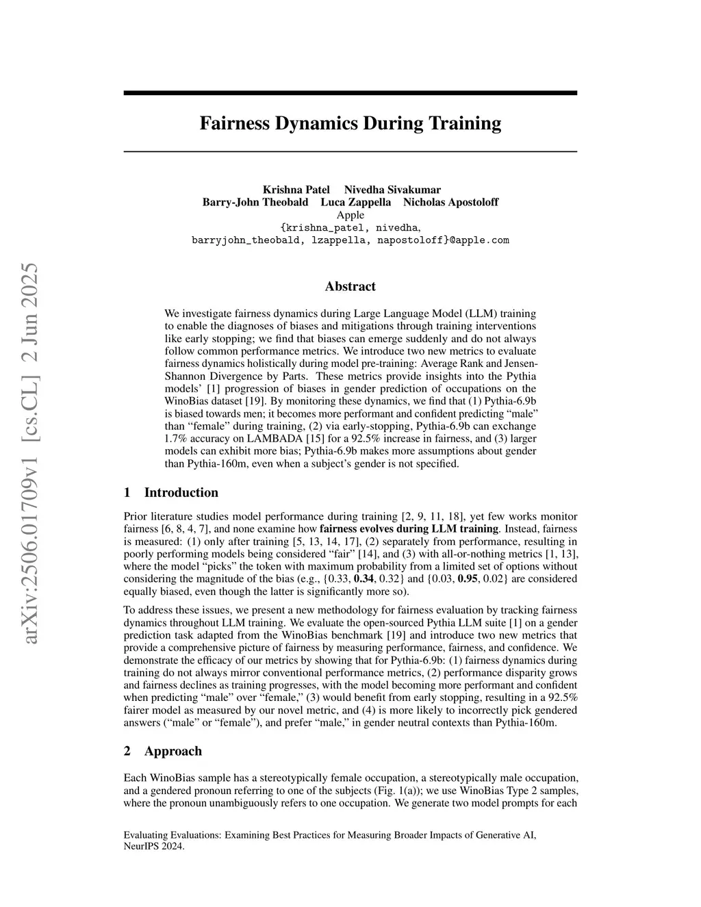 We investigate fairness dynamics during Large Language Model (LLM) training to enable the diagnoses of biases and mitigations through training interventions like early stopping; we find that biases can emerge suddenly and do not always follow common performance metrics. We introduce two new metrics to evaluate fairness dynamics holistically during model pre-training: Average Rank and Jensen-Shannon Divergence by Parts. These metrics provide insights into the Pythia models' progression of biases in gender prediction of occupations on the WinoBias dataset. By monitoring these dynamics, we find that (1) Pythia-6.9b is biased towards men; it becomes more performant and confident predicting "male" than "female" during training, (2) via early-stopping, Pythia-6.9b can exchange 1.7% accuracy on LAMBADA for a 92.5% increase in fairness, and (3) larger models can exhibit more bias; Pythia-6.9b makes more assumptions about gender than Pythia-160m, even when a subject's gender is not specified.