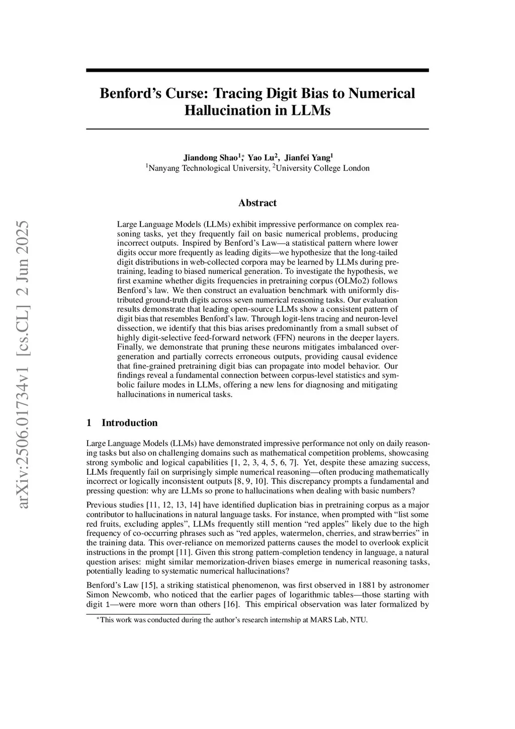 Large Language Models (LLMs) exhibit impressive performance on complex reasoning tasks, yet they frequently fail on basic numerical problems, producing incorrect outputs. Inspired by Benford's Law, a statistical pattern in which lower digits occur more frequently as leading digits, we hypothesize that the skewed digit distributions in web-collected corpora may be learned by LLMs during pretraining, leading to biased numerical generation. To investigate the hypothesis, we first examine whether digits frequencies in pretraining corpus (OLMo2) follows Benford's law. We then construct an evaluation benchmark in which the ground-truth digits are uniformly distributed within each of the seven numerical reasoning tasks. Our evaluation results demonstrate that leading open-source LLMs show a consistent pattern of digit bias that resembles Benford's law. Through logit-lens tracing and neuron-level dissection, we identify that this bias arises predominantly from a small subset of highly digit-selective feed-forward network (FFN) neurons in the deeper layers. Finally, we demonstrate that pruning these neurons mitigates imbalanced overgeneration and partially corrects erroneous outputs, providing causal evidence that fine-grained pretraining digit bias can propagate into model behavior. Our findings reveal a fundamental connection between corpus-level statistics and symbolic failure modes in LLMs, offering a new lens for diagnosing and mitigating hallucinations in numerical tasks.