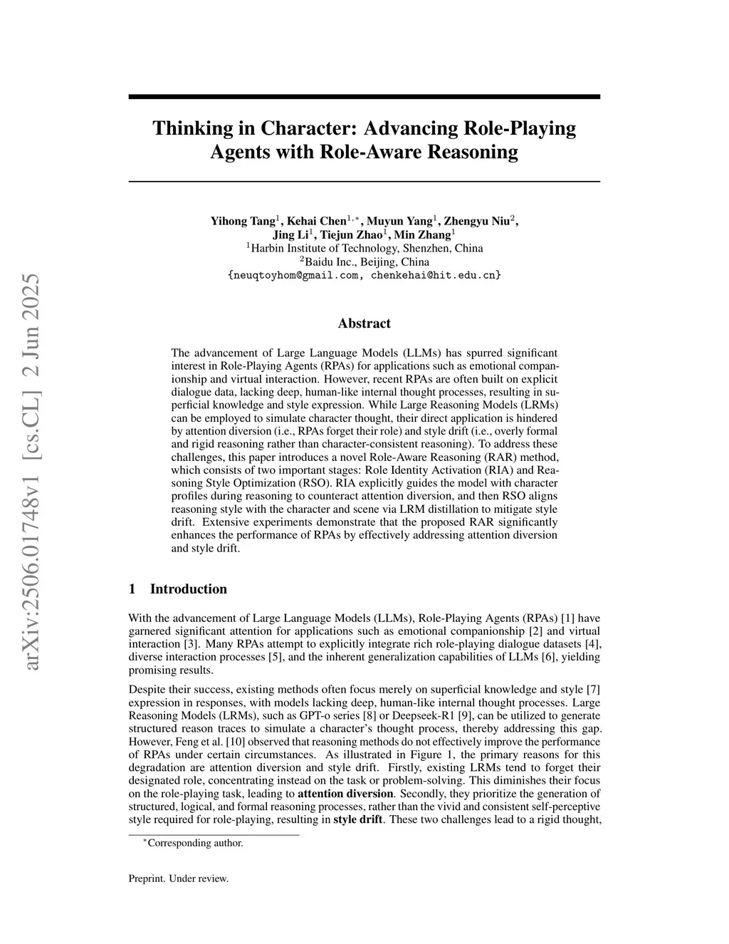 The advancement of Large Language Models (LLMs) has spurred significant interest in Role-Playing Agents (RPAs) for applications such as emotional companionship and virtual interaction. However, recent RPAs are often built on explicit dialogue data, lacking deep, human-like internal thought processes, resulting in superficial knowledge and style expression. While Large Reasoning Models (LRMs) can be employed to simulate character thought, their direct application is hindered by attention diversion (i.e., RPAs forget their role) and style drift (i.e., overly formal and rigid reasoning rather than character-consistent reasoning). To address these challenges, this paper introduces a novel Role-Aware Reasoning (RAR) method, which consists of two important stages: Role Identity Activation (RIA) and Reasoning Style Optimization (RSO). RIA explicitly guides the model with character profiles during reasoning to counteract attention diversion, and then RSO aligns reasoning style with the character and scene via LRM distillation to mitigate style drift. Extensive experiments demonstrate that the proposed RAR significantly enhances the performance of RPAs by effectively addressing attention diversion and style drift.