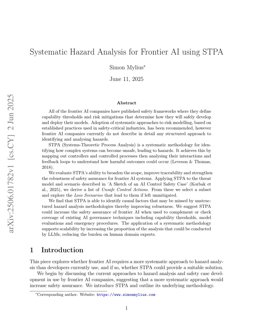 All of the frontier AI companies have published safety frameworks where they define capability thresholds and risk mitigations that determine how they will safely develop and deploy their models. Adoption of systematic approaches to risk modelling, based on established practices used in safety-critical industries, has been recommended, however frontier AI companies currently do not describe in detail any structured approach to identifying and analysing hazards. STPA (Systems-Theoretic Process Analysis) is a systematic methodology for identifying how complex systems can become unsafe, leading to hazards. It achieves this by mapping out controllers and controlled processes then analysing their interactions and feedback loops to understand how harmful outcomes could occur (Leveson & Thomas, 2018). We evaluate STPA's ability to broaden the scope, improve traceability and strengthen the robustness of safety assurance for frontier AI systems. Applying STPA to the threat model and scenario described in Á Sketch of an AI Control Safety Case' (Korbak et al., 2025), we derive a list of Unsafe Control Actions. From these we select a subset and explore the Loss Scenarios that lead to them if left unmitigated. We find that STPA is able to identify causal factors that may be missed by unstructured hazard analysis methodologies thereby improving robustness. We suggest STPA could increase the safety assurance of frontier AI when used to complement or check coverage of existing AI governance techniques including capability thresholds, model evaluations and emergency procedures. The application of a systematic methodology supports scalability by increasing the proportion of the analysis that could be conducted by LLMs, reducing the burden on human domain experts.