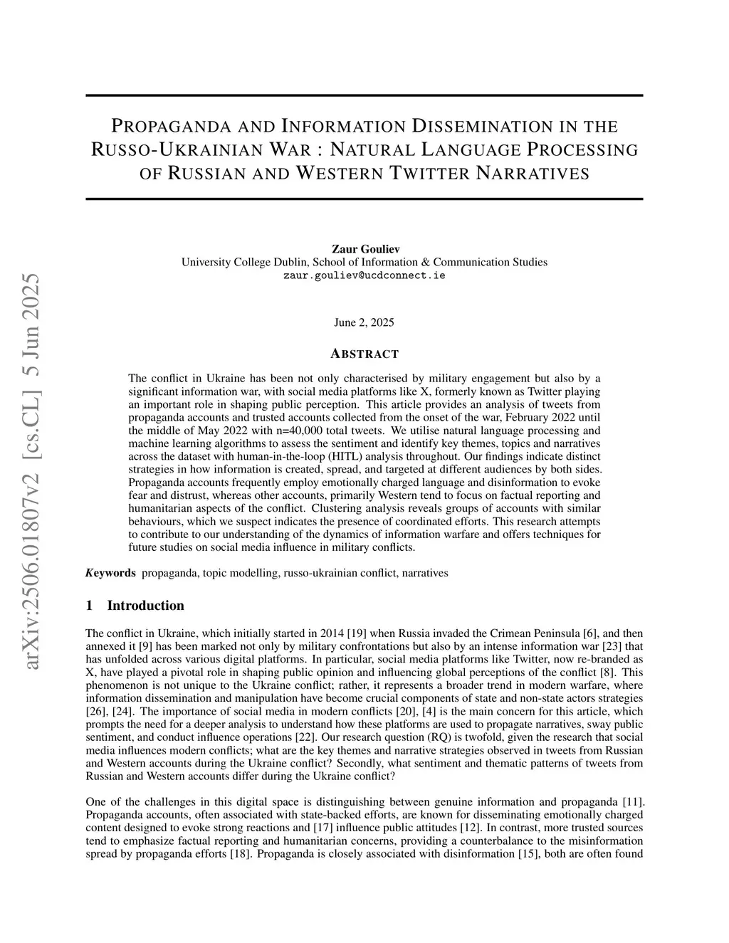 The conflict in Ukraine has been not only characterised by military engagement but also by a significant information war, with social media platforms like X, formerly known as Twitter playing an important role in shaping public perception. This article provides an analysis of tweets from propaganda accounts and trusted accounts collected from the onset of the war, February 2022 until the middle of May 2022 with n=40,000 total tweets. We utilise natural language processing and machine learning algorithms to assess the sentiment and identify key themes, topics and narratives across the dataset with human-in-the-loop (HITL) analysis throughout. Our findings indicate distinct strategies in how information is created, spread, and targeted at different audiences by both sides. Propaganda accounts frequently employ emotionally charged language and disinformation to evoke fear and distrust, whereas other accounts, primarily Western tend to focus on factual reporting and humanitarian aspects of the conflict. Clustering analysis reveals groups of accounts with similar behaviours, which we suspect indicates the presence of coordinated efforts. This research attempts to contribute to our understanding of the dynamics of information warfare and offers techniques for future studies on social media influence in military conflicts.