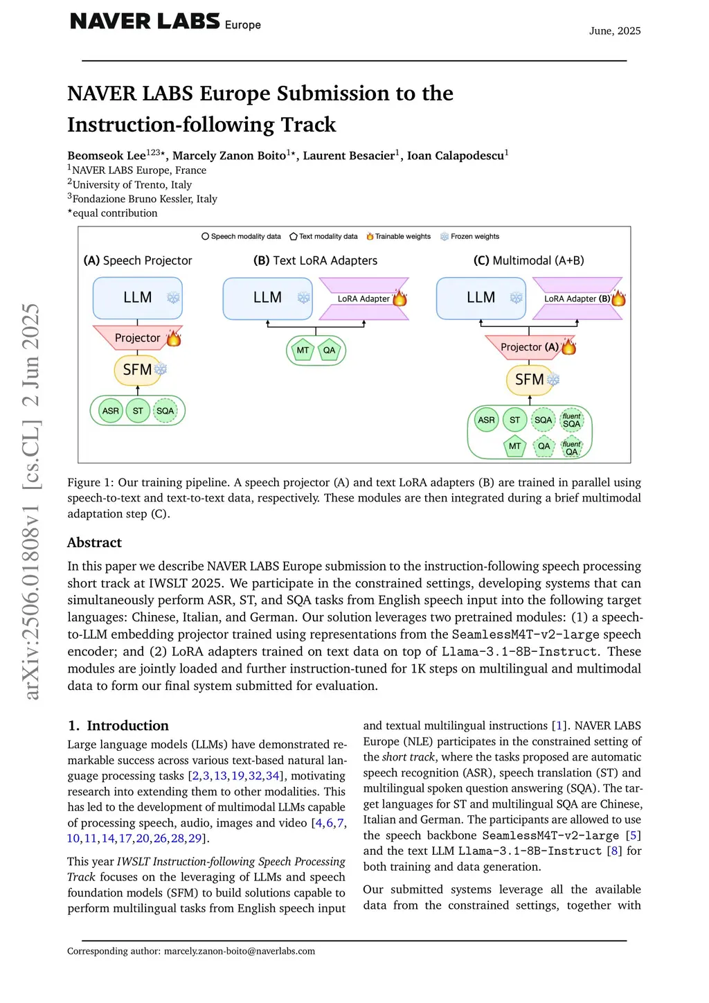In this paper we describe NAVER LABS Europe submission to the instruction-following speech processing short track at IWSLT 2025. We participate in the constrained settings, developing systems that can simultaneously perform ASR, ST, and SQA tasks from English speech input into the following target languages: Chinese, Italian, and German. Our solution leverages two pretrained modules: (1) a speech-to-LLM embedding projector trained using representations from the SeamlessM4T-v2-large speech encoder; and (2) LoRA adapters trained on text data on top of a Llama-3.1-8B-Instruct. These modules are jointly loaded and further instruction-tuned for 1K steps on multilingual and multimodal data to form our final system submitted for evaluation.