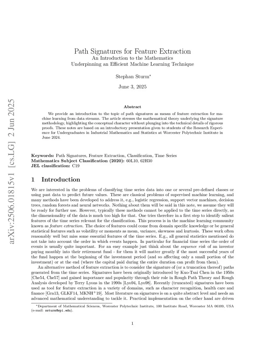 Path Signatures for Feature Extraction. An Introduction to the Mathematics Underpinning an Efficient Machine Learning Technique
