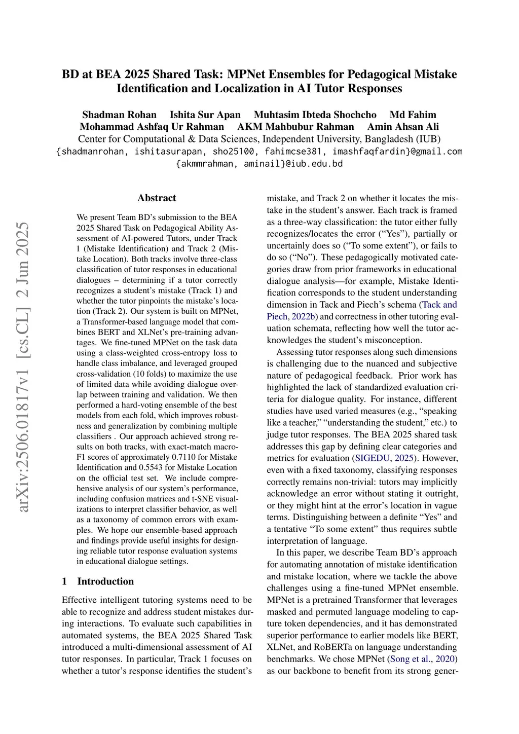 We present Team BD's submission to the BEA 2025 Shared Task on Pedagogical Ability Assessment of AI-powered Tutors, under Track 1 (Mistake Identification) and Track 2 (Mistake Location). Both tracks involve three-class classification of tutor responses in educational dialogues - determining if a tutor correctly recognizes a student's mistake (Track 1) and whether the tutor pinpoints the mistake's location (Track 2). Our system is built on MPNet, a Transformer-based language model that combines BERT and XLNet's pre-training advantages. We fine-tuned MPNet on the task data using a class-weighted cross-entropy loss to handle class imbalance, and leveraged grouped cross-validation (10 folds) to maximize the use of limited data while avoiding dialogue overlap between training and validation. We then performed a hard-voting ensemble of the best models from each fold, which improves robustness and generalization by combining multiple classifiers. Our approach achieved strong results on both tracks, with exact-match macro-F1 scores of approximately 0.7110 for Mistake Identification and 0.5543 for Mistake Location on the official test set. We include comprehensive analysis of our system's performance, including confusion matrices and t-SNE visualizations to interpret classifier behavior, as well as a taxonomy of common errors with examples. We hope our ensemble-based approach and findings provide useful insights for designing reliable tutor response evaluation systems in educational dialogue settings.