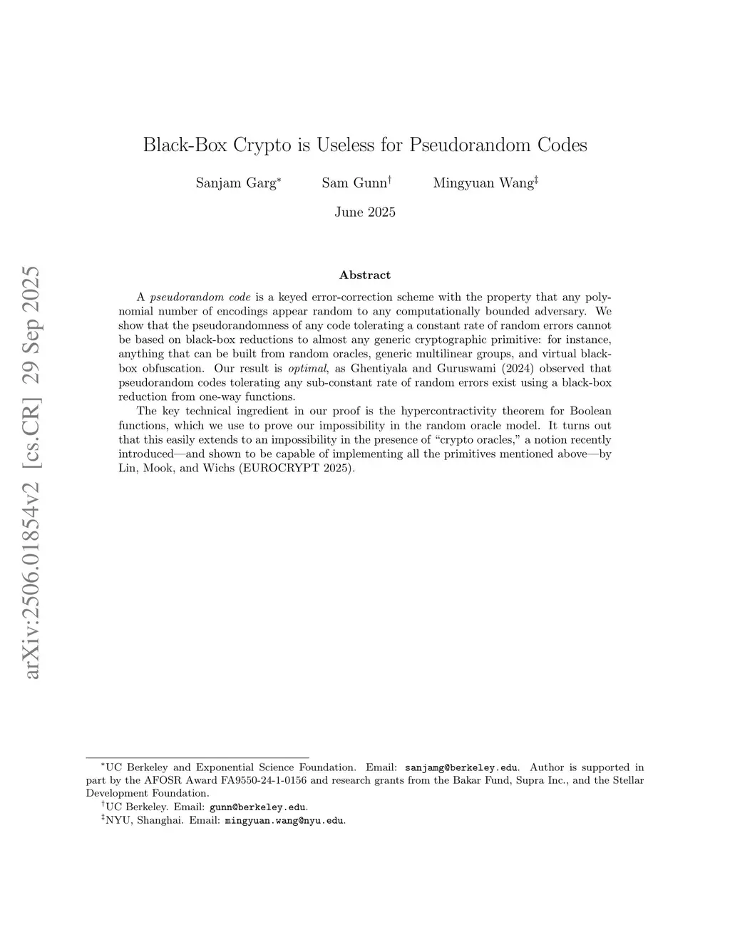 A pseudorandom code is a keyed error-correction scheme with the property that any polynomial number of encodings appear random to any computationally bounded adversary. We show that the pseudorandomness of any code tolerating a constant rate of random errors cannot be based on black-box reductions to almost any generic cryptographic primitive: for instance, anything that can be built from random oracles, generic multilinear groups, and virtual black-box obfuscation. Our result is optimal, as Ghentiyala and Guruswami (2024) observed that pseudorandom codes tolerating any sub-constant rate of random errors exist using a black-box reduction from one-way functions.The key technical ingredient in our proof is the hypercontractivity theorem for Boolean functions, which we use to prove our impossibility in the random oracle model. It turns out that this easily extends to an impossibility in the presence of ``crypto oracles,'' a notion recently introduced -- and shown to be capable of implementing all the primitives mentioned above -- by Lin, Mook, and Wichs (EUROCRYPT 2025).