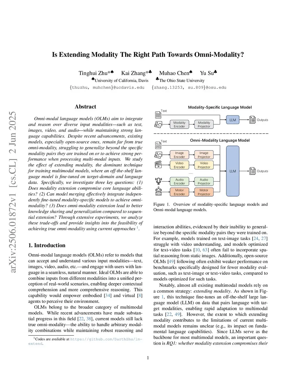Omni-modal language models (OLMs) aim to integrate and reason over diverse input modalities--such as text, images, video, and audio--while maintaining strong language capabilities. Despite recent advancements, existing models, especially open-source ones, remain far from true omni-modality, struggling to generalize beyond the specific modality pairs they are trained on or to achieve strong performance when processing multi-modal inputs. We study the effect of extending modality, the dominant technique for training multimodal models, where an off-the-shelf language model is fine-tuned on target-domain and language data. Specifically, we investigate three key questions: (1) Does modality extension compromise core language abilities? (2) Can model merging effectively integrate independently fine-tuned modality-specific models to achieve omni-modality? (3) Does omni-modality extension lead to better knowledge sharing and generalization compared to sequential extension? Through extensive experiments, we analyze these trade-offs and provide insights into the feasibility of achieving true omni-modality using current approaches.