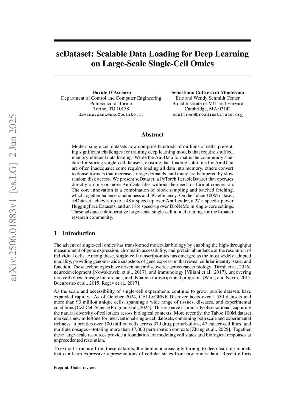 Training deep learning models on single-cell datasets with hundreds of millions of cells requires loading data from disk, as these datasets exceed available memory. While random sampling provides the data diversity needed for effective training, it is prohibitively slow due to the random access pattern overhead, whereas sequential streaming achieves high throughput but introduces biases that degrade model performance. We present scDataset, a PyTorch data loader that enables efficient training from on-disk data with seamless integration across diverse storage formats. Our approach combines block sampling and batched fetching to achieve quasi-random sampling that balances I/O efficiency with minibatch diversity. On Tahoe-100M, a dataset of 100 million cells, scDataset achieves more than two orders of magnitude speedup compared to true random sampling while working directly with AnnData files. We provide theoretical bounds on minibatch diversity and empirically show that scDataset matches the performance of true random sampling across multiple classification tasks.
