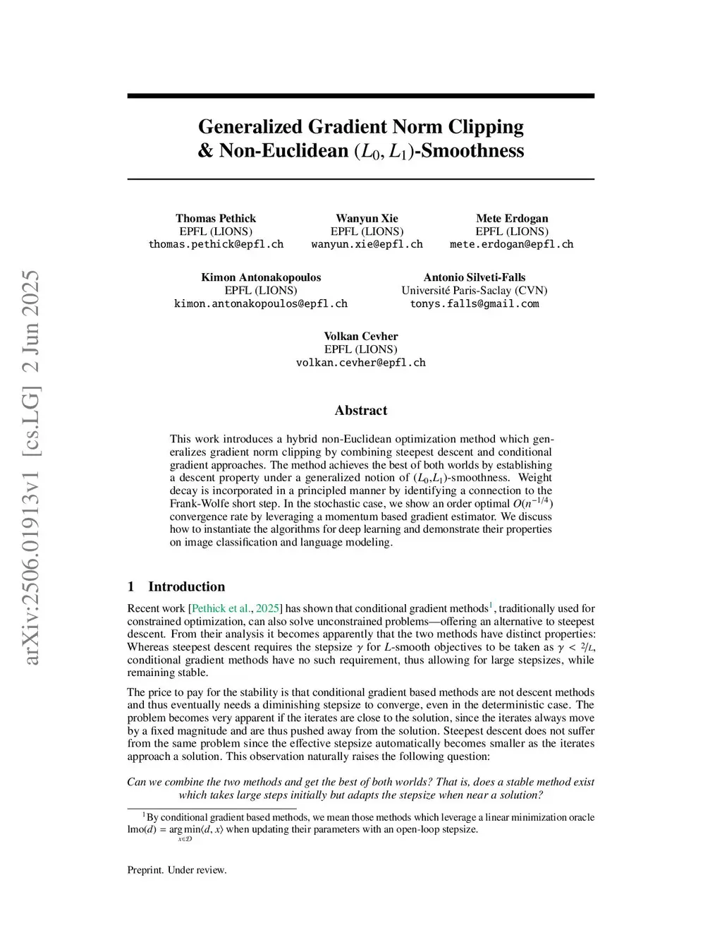 This work introduces a hybrid non-Euclidean optimization method which generalizes gradient norm clipping by combining steepest descent and conditional gradient approaches. The method achieves the best of both worlds by establishing a descent property under a generalized notion of (,)-smoothness. Weight decay is incorporated in a principled manner by identifying a connection to the Frank-Wolfe short step. In the stochastic case, we show an order optimal convergence rate by leveraging a momentum based gradient estimator. We discuss how to instantiate the algorithms for deep learning, which we dub Clipped Scion, and demonstrate their properties on image classification and language modeling. The code is available atthis https URL.