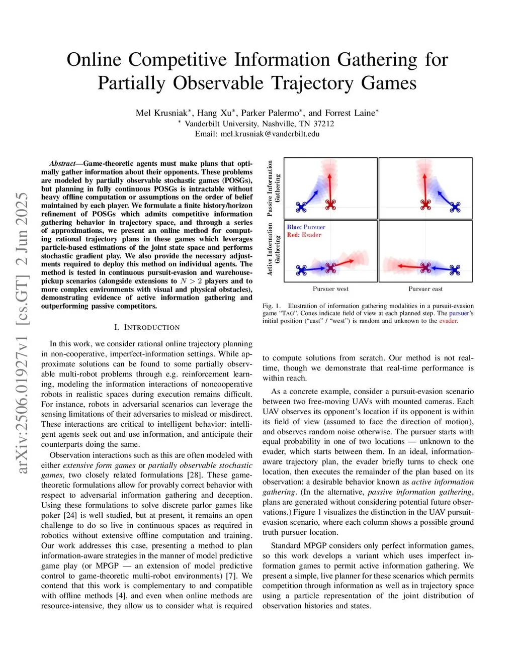 Game-theoretic agents must make plans that optimally gather information about their opponents. These problems are modeled by partially observable stochastic games (POSGs), but planning in fully continuous POSGs is intractable without heavy offline computation or assumptions on the order of belief maintained by each player. We formulate a finite history/horizon refinement of POSGs which admits competitive information gathering behavior in trajectory space, and through a series of approximations, we present an online method for computing rational trajectory plans in these games which leverages particle-based estimations of the joint state space and performs stochastic gradient play. We also provide the necessary adjustments required to deploy this method on individual agents. The method is tested in continuous pursuit-evasion and warehouse-pickup scenarios (alongside extensions to players and to more complex environments with visual and physical obstacles), demonstrating evidence of active information gathering and outperforming passive competitors.