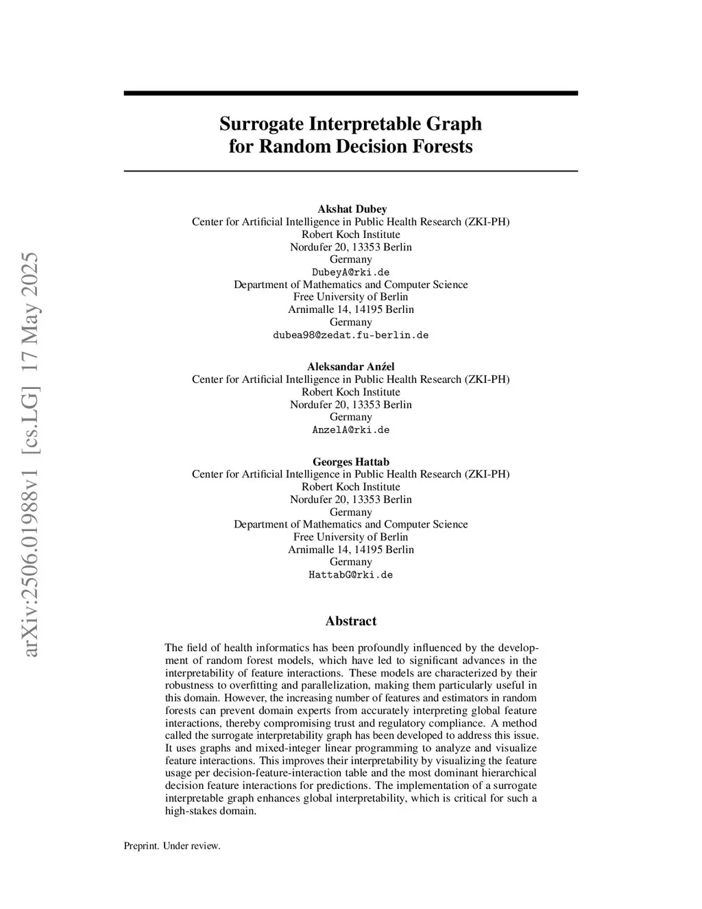 The field of health informatics has been profoundly influenced by the development of random forest models, which have led to significant advances in the interpretability of feature interactions. These models are characterized by their robustness to overfitting and parallelization, making them particularly useful in this domain. However, the increasing number of features and estimators in random forests can prevent domain experts from accurately interpreting global feature interactions, thereby compromising trust and regulatory compliance. A method called the surrogate interpretability graph has been developed to address this issue. It uses graphs and mixed-integer linear programming to analyze and visualize feature interactions. This improves their interpretability by visualizing the feature usage per decision-feature-interaction table and the most dominant hierarchical decision feature interactions for predictions. The implementation of a surrogate interpretable graph enhances global interpretability, which is critical for such a high-stakes domain.