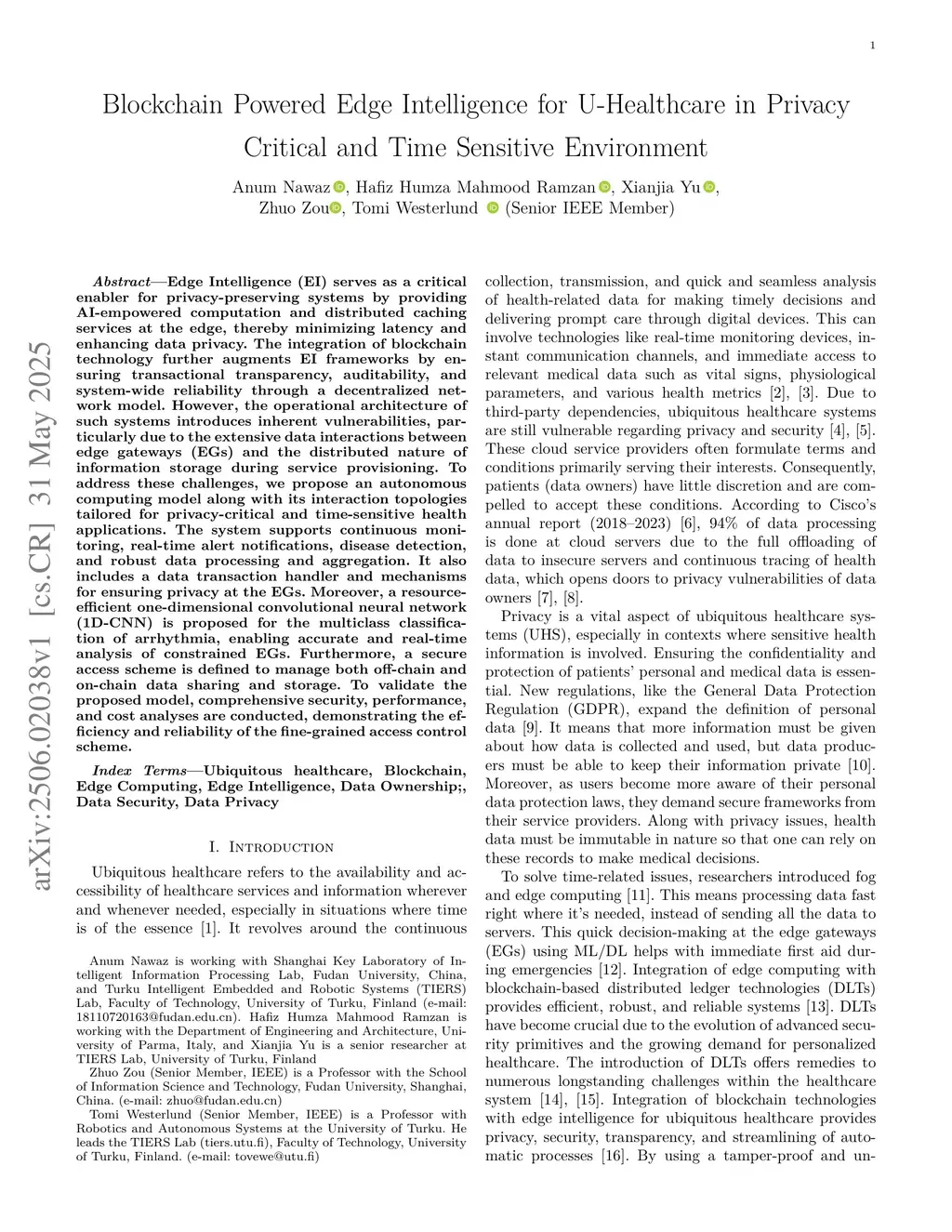 Edge Intelligence (EI) serves as a critical enabler for privacy-preserving systems by providing AI-empowered computation and distributed caching services at the edge, thereby minimizing latency and enhancing data privacy. The integration of blockchain technology further augments EI frameworks by ensuring transactional transparency, auditability, and system-wide reliability through a decentralized network model. However, the operational architecture of such systems introduces inherent vulnerabilities, particularly due to the extensive data interactions between edge gateways (EGs) and the distributed nature of information storage during service provisioning. To address these challenges, we propose an autonomous computing model along with its interaction topologies tailored for privacy-critical and time-sensitive health applications. The system supports continuous monitoring, real-time alert notifications, disease detection, and robust data processing and aggregation. It also includes a data transaction handler and mechanisms for ensuring privacy at the EGs. Moreover, a resource-efficient one-dimensional convolutional neural network (1D-CNN) is proposed for the multiclass classification of arrhythmia, enabling accurate and real-time analysis of constrained EGs. Furthermore, a secure access scheme is defined to manage both off-chain and on-chain data sharing and storage. To validate the proposed model, comprehensive security, performance, and cost analyses are conducted, demonstrating the efficiency and reliability of the fine-grained access control scheme.