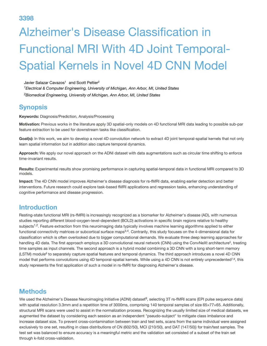 Alzheimers Disease Classification in Functional MRI With 4D Joint Temporal-Spatial Kernels in Novel 4D CNN Model