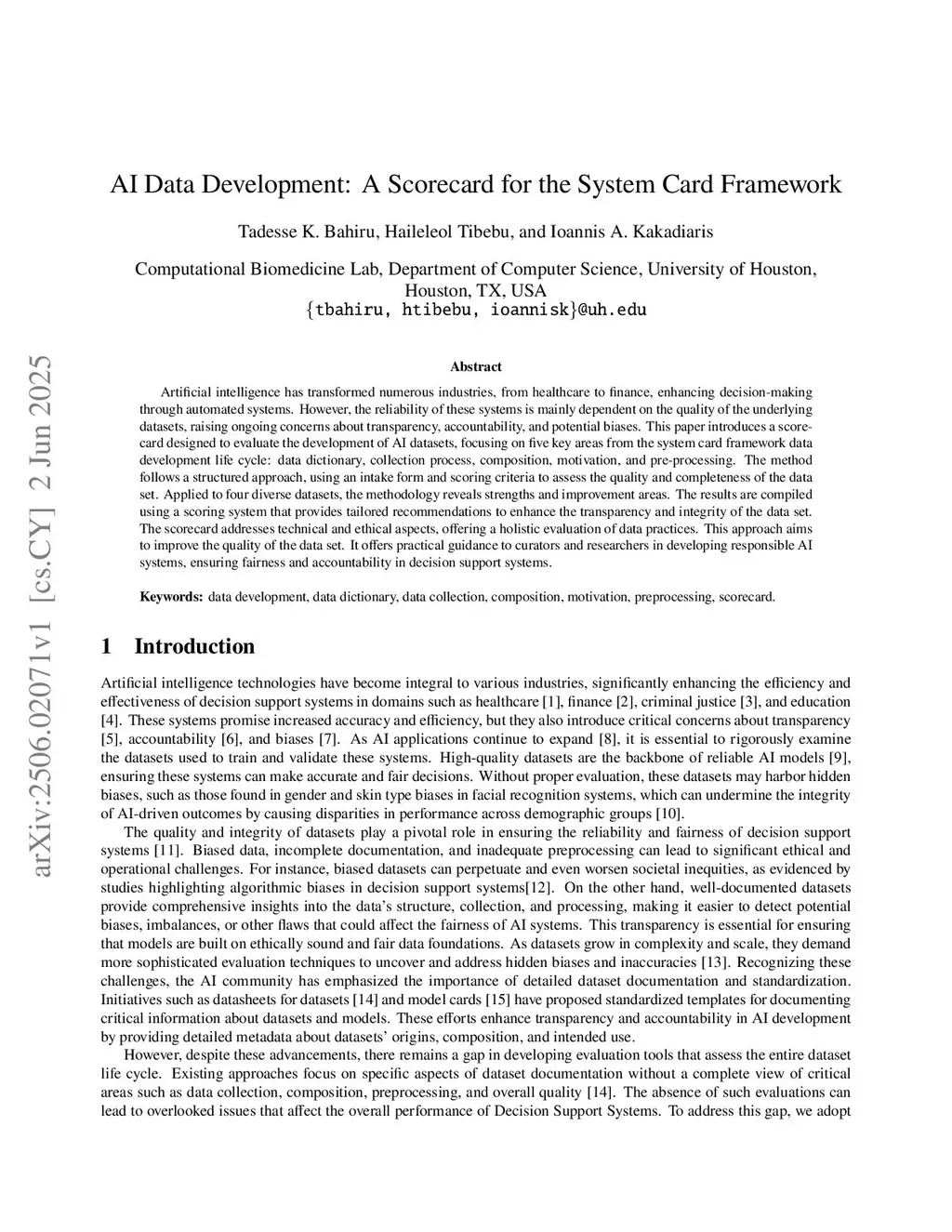 Artificial intelligence has transformed numerous industries, from healthcare to finance, enhancing decision-making through automated systems. However, the reliability of these systems is mainly dependent on the quality of the underlying datasets, raising ongoing concerns about transparency, accountability, and potential biases. This paper introduces a scorecard designed to evaluate the development of AI datasets, focusing on five key areas from the system card framework data development life cycle: data dictionary, collection process, composition, motivation, and pre-processing. The method follows a structured approach, using an intake form and scoring criteria to assess the quality and completeness of the data set. Applied to four diverse datasets, the methodology reveals strengths and improvement areas. The results are compiled using a scoring system that provides tailored recommendations to enhance the transparency and integrity of the data set. The scorecard addresses technical and ethical aspects, offering a holistic evaluation of data practices. This approach aims to improve the quality of the data set. It offers practical guidance to curators and researchers in developing responsible AI systems, ensuring fairness and accountability in decision support systems.