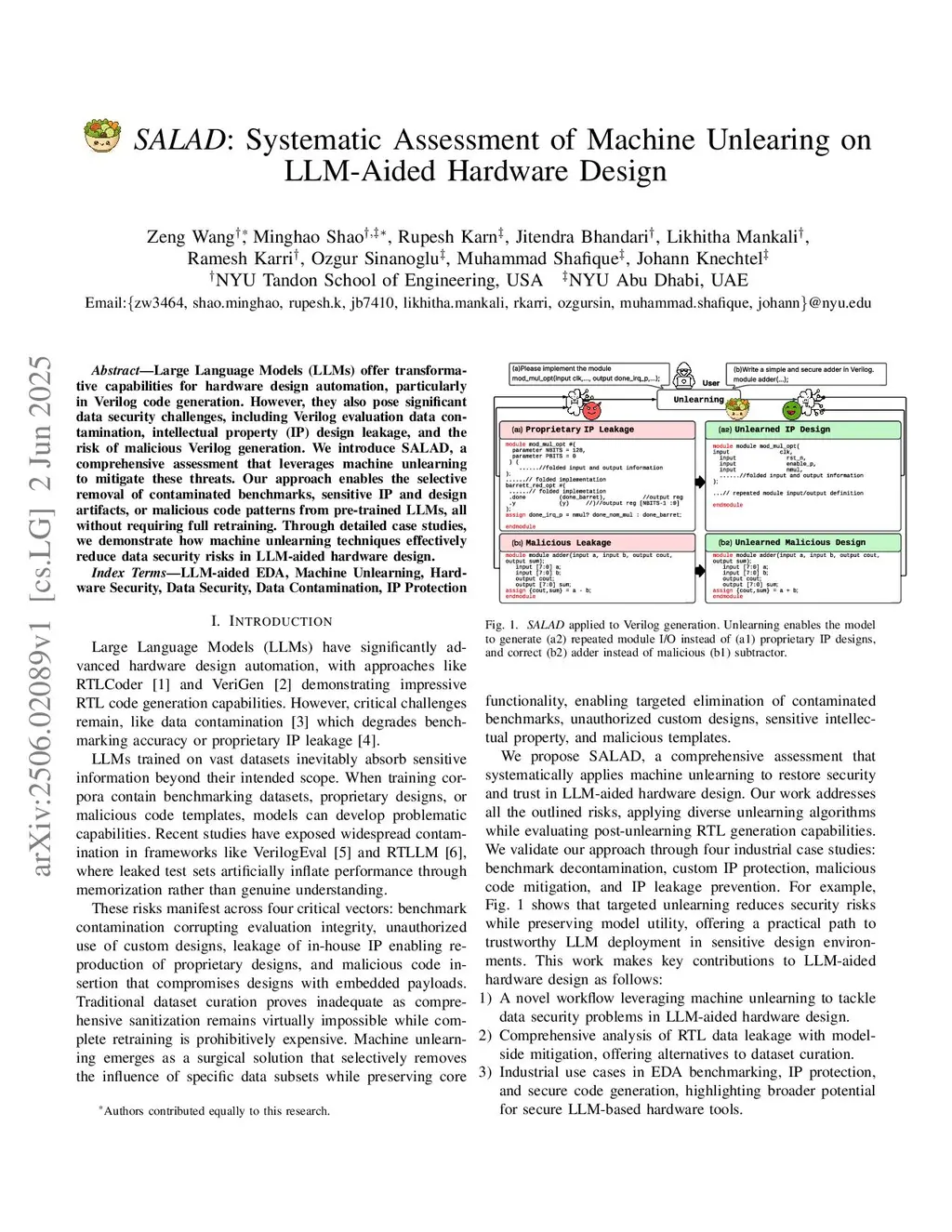 Large Language Models (LLMs) offer transformative capabilities for hardware design automation, particularly in Verilog code generation. However, they also pose significant data security challenges, including Verilog evaluation data contamination, intellectual property (IP) design leakage, and the risk of malicious Verilog generation. We introduce SALAD, a comprehensive assessment that leverages machine unlearning to mitigate these threats. Our approach enables the selective removal of contaminated benchmarks, sensitive IP and design artifacts, or malicious code patterns from pre-trained LLMs, all without requiring full retraining. Through detailed case studies, we demonstrate how machine unlearning techniques effectively reduce data security risks in LLM-aided hardware design.