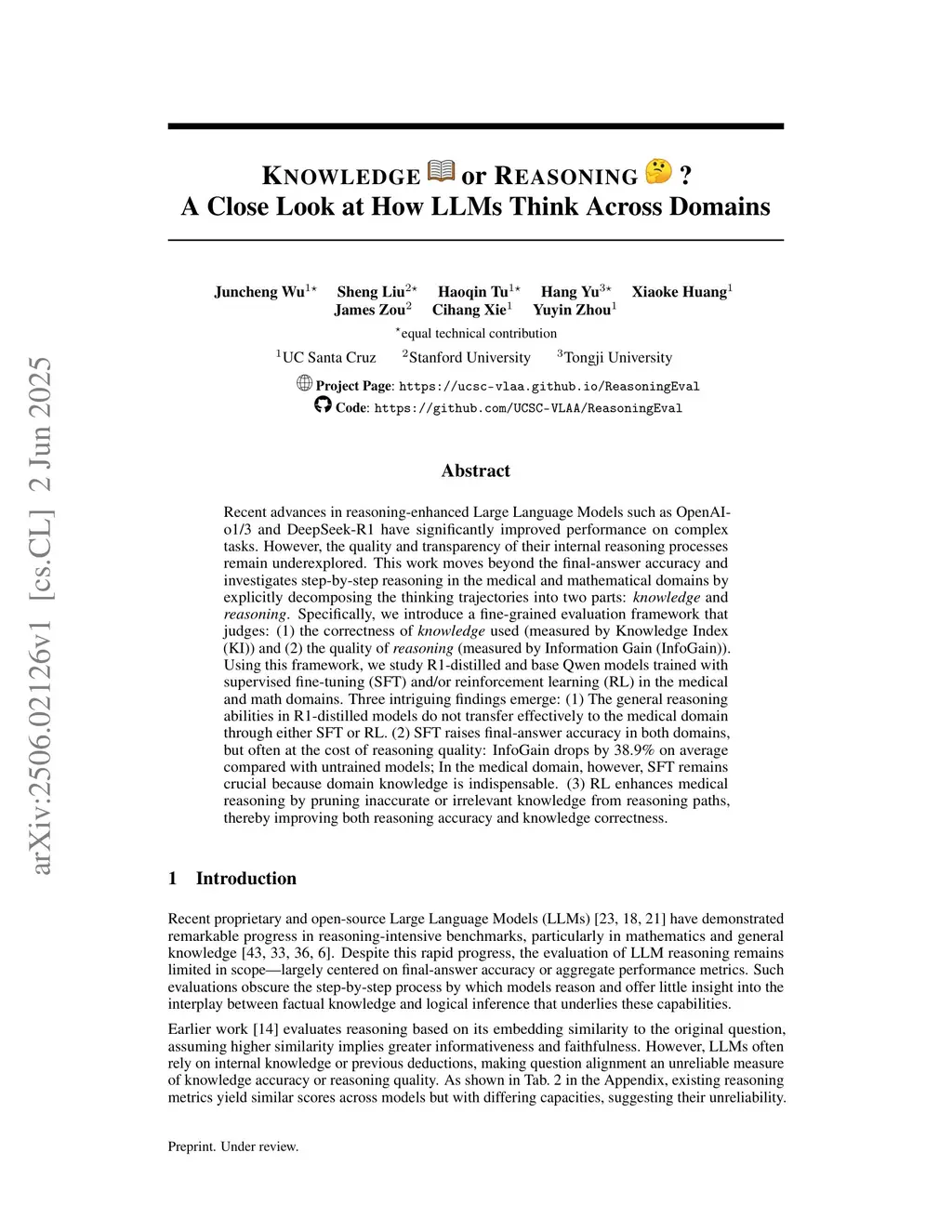 Recent advances in reasoning-enhanced Large Language Models such as OpenAI-o1/3 and DeepSeek-R1 have significantly improved performance on complex tasks. However, the quality and transparency of their internal reasoning processes remain underexplored. This work moves beyond the final-answer accuracy and investigates step-by-step reasoning in the medical and mathematical domains by explicitly decomposing the thinking trajectories into two parts: knowledge and reasoning. Specifically, we introduce a fine-grained evaluation framework that judges: (1) the correctness of knowledge used (measured by Knowledge Index (KI)) and (2) the quality of reasoning (measured by Information Gain (InfoGain)). Using this framework, we study R1-distilled and base Qwen models trained with supervised fine-tuning (SFT) and/or reinforcement learning (RL) in the medical and math domains. Three intriguing findings emerge: (1) The general reasoning abilities in R1-distilled models do not transfer effectively to the medical domain through either SFT or RL. (2) SFT raises final-answer accuracy in both domains, but often at the cost of reasoning quality: InfoGain drops by 38.9% on average compared with untrained models; In the medical domain, however, SFT remains crucial because domain knowledge is indispensable. (3) RL enhances medical reasoning by pruning inaccurate or irrelevant knowledge from reasoning paths, thereby improving both reasoning accuracy and knowledge correctness.