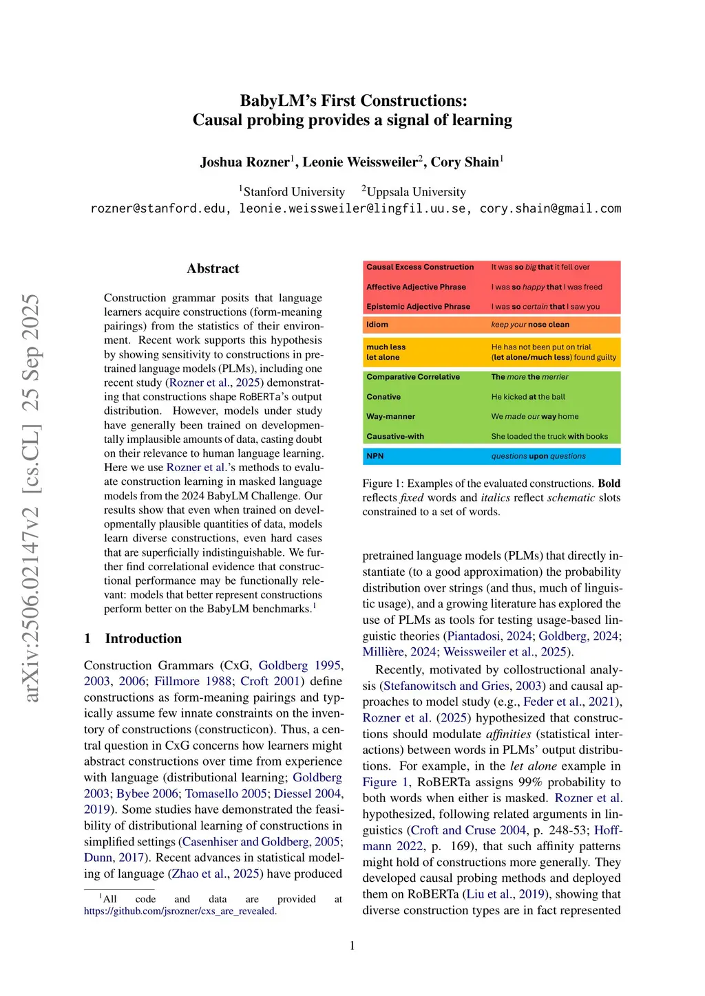BabyLM's First Constructions: Causal probing provides a signal of learning