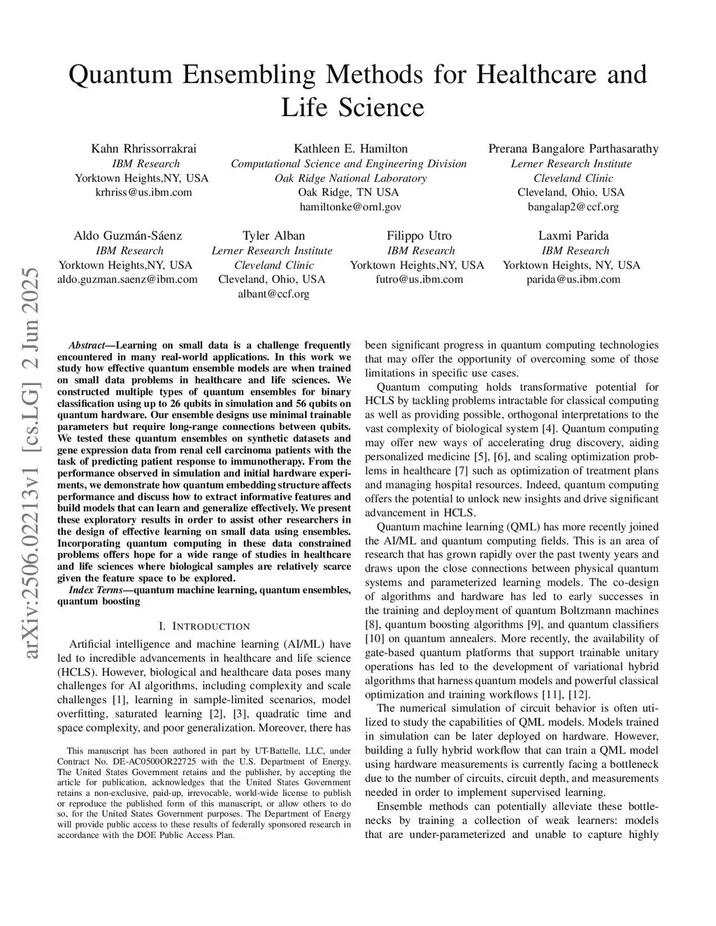 Learning on small data is a challenge frequently encountered in many real-world applications. In this work we study how effective quantum ensemble models are when trained on small data problems in healthcare and life sciences. We constructed multiple types of quantum ensembles for binary classification using up to 26 qubits in simulation and 56 qubits on quantum hardware. Our ensemble designs use minimal trainable parameters but require long-range connections between qubits. We tested these quantum ensembles on synthetic datasets and gene expression data from renal cell carcinoma patients with the task of predicting patient response to immunotherapy. From the performance observed in simulation and initial hardware experiments, we demonstrate how quantum embedding structure affects performance and discuss how to extract informative features and build models that can learn and generalize effectively. We present these exploratory results in order to assist other researchers in the design of effective learning on small data using ensembles. Incorporating quantum computing in these data constrained problems offers hope for a wide range of studies in healthcare and life sciences where biological samples are relatively scarce given the feature space to be explored.