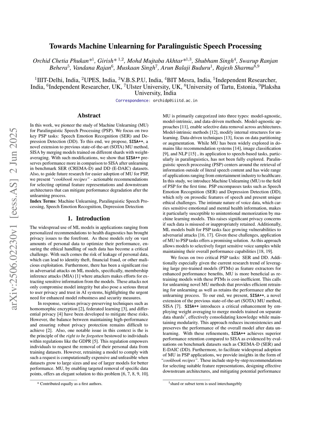 In this work, we pioneer the study of Machine Unlearning (MU) for Paralinguistic Speech Processing (PSP). We focus on two key PSP tasks: Speech Emotion Recognition (SER) and Depression Detection (DD). To this end, we propose, SISA++, a novel extension to previous state-of-the-art (SOTA) MU method, SISA by merging models trained on different shards with weight-averaging. With such modifications, we show that SISA++ preserves performance more in comparison to SISA after unlearning in benchmark SER (CREMA-D) and DD (E-DAIC) datasets. Also, to guide future research for easier adoption of MU for PSP, we present ``cookbook recipes'' - actionable recommendations for selecting optimal feature representations and downstream architectures that can mitigate performance degradation after the unlearning process.