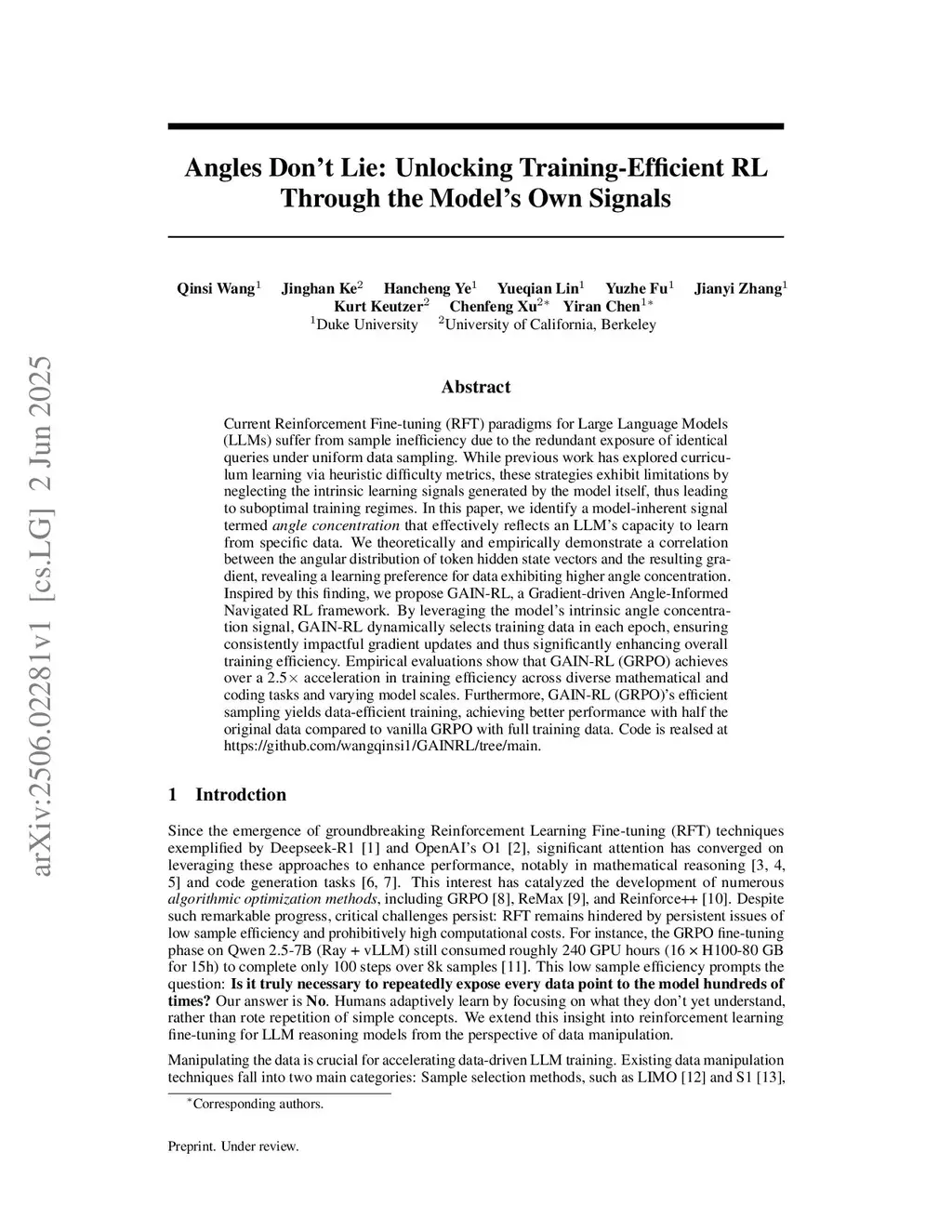 Current Reinforcement Fine-tuning (RFT) paradigms for Large Language Models (LLMs) suffer from sample inefficiency due to the redundant exposure of identical queries under uniform data sampling. While previous work has explored curriculum learning via heuristic difficulty metrics, these strategies exhibit limitations by neglecting the intrinsic learning signals generated by the model itself, thus leading to suboptimal training regimes. In this paper, we identify a model-inherent signal termed angle concentration that effectively reflects an LLM's capacity to learn from specific data. We theoretically and empirically demonstrate a correlation between the angular distribution of token hidden state vectors and the resulting gradient, revealing a learning preference for data exhibiting higher angle concentration. Inspired by this finding, we propose GAIN-RL, a Gradient-driven Angle-Informed Navigated RL framework. By leveraging the model's intrinsic angle concentration signal, GAIN-RL dynamically selects training data in each epoch, ensuring consistently impactful gradient updates and thus significantly enhancing overall training efficiency. Empirical evaluations show that GAIN-RL (GRPO) achieves over a 2.5x acceleration in training efficiency across diverse mathematical and coding tasks and varying model scales. Furthermore, GAIN-RL (GRPO)'s efficient sampling yields data-efficient training, achieving better performance with half the original data compared to vanilla GRPO with full training data. Code is realsed atthis https URL.