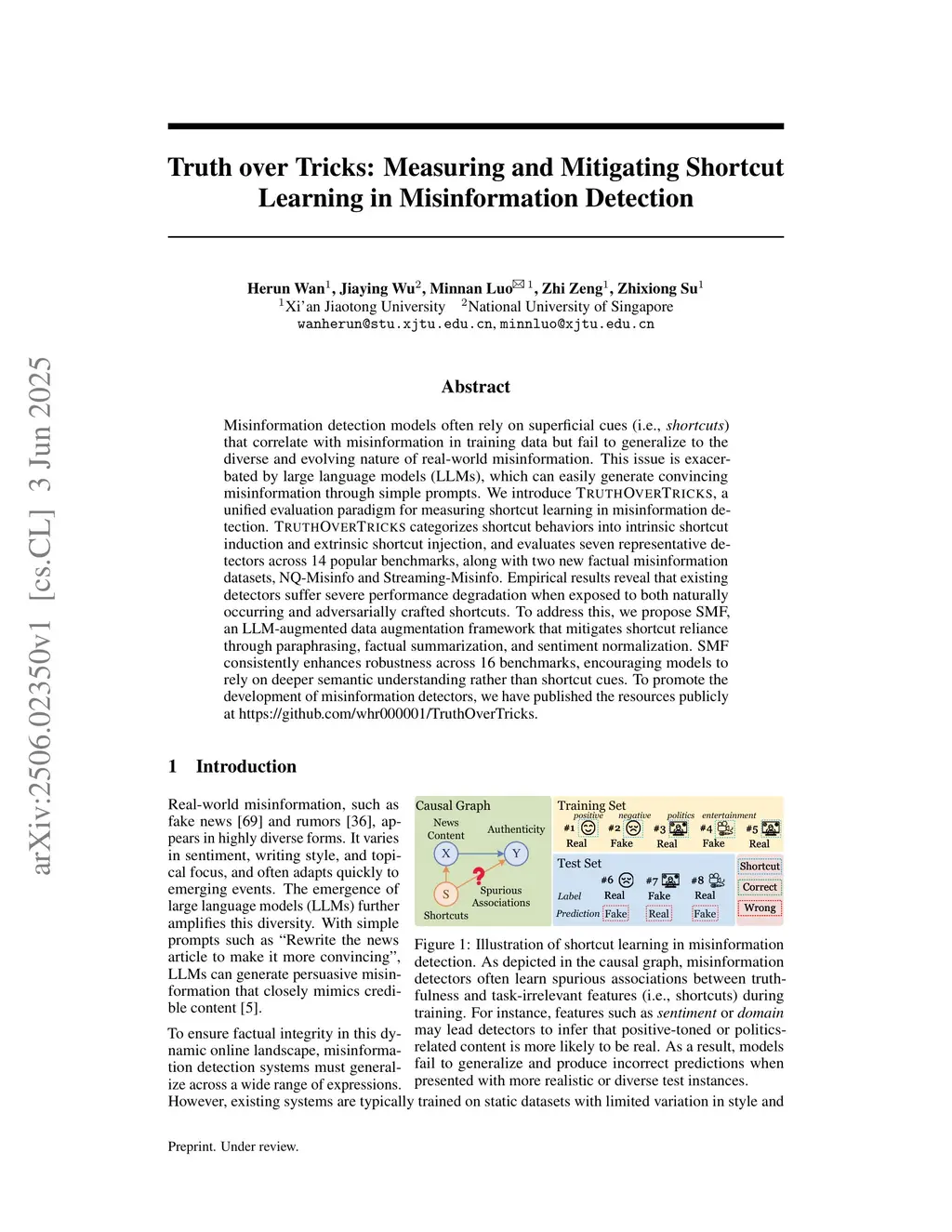Misinformation detection models often rely on superficial cues (i.e., \emph{shortcuts}) that correlate with misinformation in training data but fail to generalize to the diverse and evolving nature of real-world misinformation. This issue is exacerbated by large language models (LLMs), which can easily generate convincing misinformation through simple prompts. We introduce TruthOverTricks, a unified evaluation paradigm for measuring shortcut learning in misinformation detection. TruthOverTricks categorizes shortcut behaviors into intrinsic shortcut induction and extrinsic shortcut injection, and evaluates seven representative detectors across 14 popular benchmarks, along with two new factual misinformation datasets, NQ-Misinfo and Streaming-Misinfo. Empirical results reveal that existing detectors suffer severe performance degradation when exposed to both naturally occurring and adversarially crafted shortcuts. To address this, we propose SMF, an LLM-augmented data augmentation framework that mitigates shortcut reliance through paraphrasing, factual summarization, and sentiment normalization. SMF consistently enhances robustness across 16 benchmarks, encouraging models to rely on deeper semantic understanding rather than shortcut cues. To promote the development of misinformation detectors, we have published the resources publicly atthis https URL.