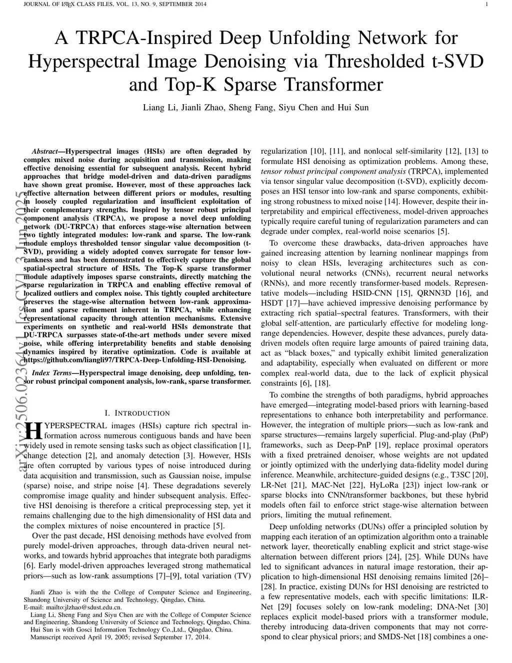 A TRPCA-Inspired Deep Unfolding Network for Hyperspectral Image Denoising via Thresholded t-SVD and Top-K Sparse Transformer