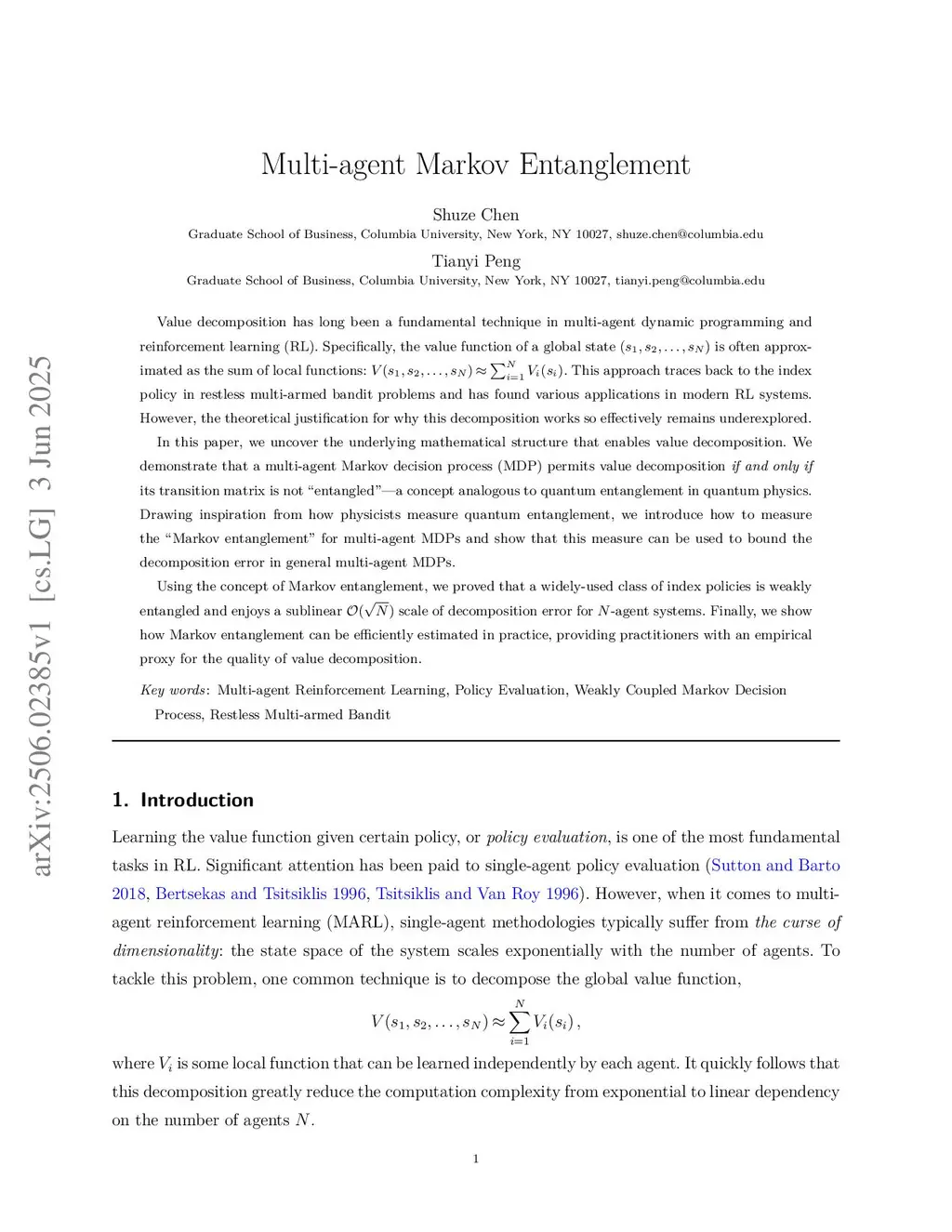 Value decomposition has long been a fundamental technique in multi-agent dynamic programming and reinforcement learning (RL). Specifically, the value function of a global state is often approximated as the sum of local functions: . This approach traces back to the index policy in restless multi-armed bandit problems and has found various applications in modern RL systems. However, the theoretical justification for why this decomposition works so effectively remains underexplored.In this paper, we uncover the underlying mathematical structure that enables value decomposition. We demonstrate that a multi-agent Markov decision process (MDP) permits value decomposition if and only if its transition matrix is not "entangled" -- a concept analogous to quantum entanglement in quantum physics. Drawing inspiration from how physicists measure quantum entanglement, we introduce how to measure the "Markov entanglement" for multi-agent MDPs and show that this measure can be used to bound the decomposition error in general multi-agent MDPs.Using the concept of Markov entanglement, we proved that a widely-used class of index policies is weakly entangled and enjoys a sublinear scale of decomposition error for -agent systems. Finally, we show how Markov entanglement can be efficiently estimated in practice, providing practitioners with an empirical proxy for the quality of value decomposition.