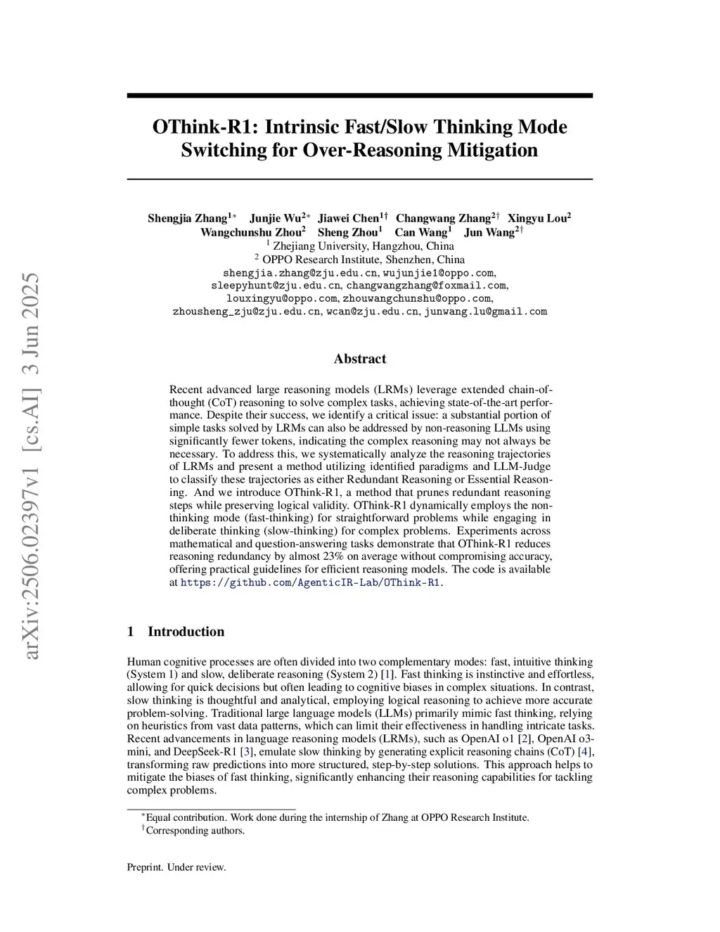 Human cognition operates through two complementary modes: fast intuitive thinking and slow deliberate thinking. Vanilla large language models (LLMs) predominantly follow the fast-thinking paradigm, producing immediate responses; while recent large reasoning models (LRMs) adopt slow-thinking strategies, generating detailed reasoning chains before arriving at answers. While LRMs often achieve higher accuracy, this comes at the cost of substantially increased token usage. To address this efficiency-accuracy trade-off, we propose OThink-R1, a hybrid reasoning framework that integrates both modes within a single LRM and enables automatic mode switching based on problem characteristics. We first identify three major patterns of essential and redundant reasoning trajectories in LRMs, which guide the design of an auxiliary LLM-based judge that adaptively determines when slow thinking is necessary. Leveraging the judge's decisions, we construct a hybrid fine-tuning dataset by pruning redundant reasoning to produce fast-thinking samples and retaining complete reasoning for slow-thinking samples. This dataset is then used to fine-tune LRMs, equipping them with inherent autonomous mode-selection capabilities. Extensive experiments on mathematical and question-answering benchmarks show that OThink-R1 reduces reasoning token usage significantly while maintaining competitive accuracy. The code is available atthis https URL.