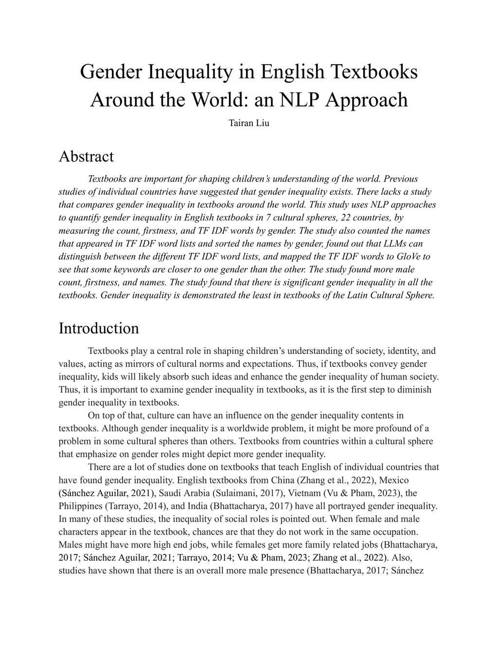 Textbooks play a critical role in shaping children's understanding of the world. While previous studies have identified gender inequality in individual countries' textbooks, few have examined the issue cross-culturally. This study applies natural language processing methods to quantify gender inequality in English textbooks from 22 countries across 7 cultural spheres. Metrics include character count, firstness (which gender is mentioned first), and TF-IDF word associations by gender. The analysis also identifies gender patterns in proper names appearing in TF-IDF word lists, tests whether large language models can distinguish between gendered word lists, and uses GloVe embeddings to examine how closely keywords associate with each gender. Results show consistent overrepresentation of male characters in terms of count, firstness, and named entities. All regions exhibit gender inequality, with the Latin cultural sphere showing the least disparity.