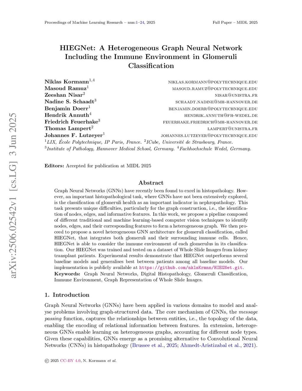 Graph Neural Networks (GNNs) have recently been found to excel in histopathology. However, an important histopathological task, where GNNs have not been extensively explored, is the classification of glomeruli health as an important indicator in nephropathology. This task presents unique difficulties, particularly for the graph construction, i.e., the identification of nodes, edges, and informative features. In this work, we propose a pipeline composed of different traditional and machine learning-based computer vision techniques to identify nodes, edges, and their corresponding features to form a heterogeneous graph. We then proceed to propose a novel heterogeneous GNN architecture for glomeruli classification, called HIEGNet, that integrates both glomeruli and their surrounding immune cells. Hence, HIEGNet is able to consider the immune environment of each glomerulus in its classification. Our HIEGNet was trained and tested on a dataset of Whole Slide Images from kidney transplant patients. Experimental results demonstrate that HIEGNet outperforms several baseline models and generalises best between patients among all baseline models. Our implementation is publicly available atthis https URL.