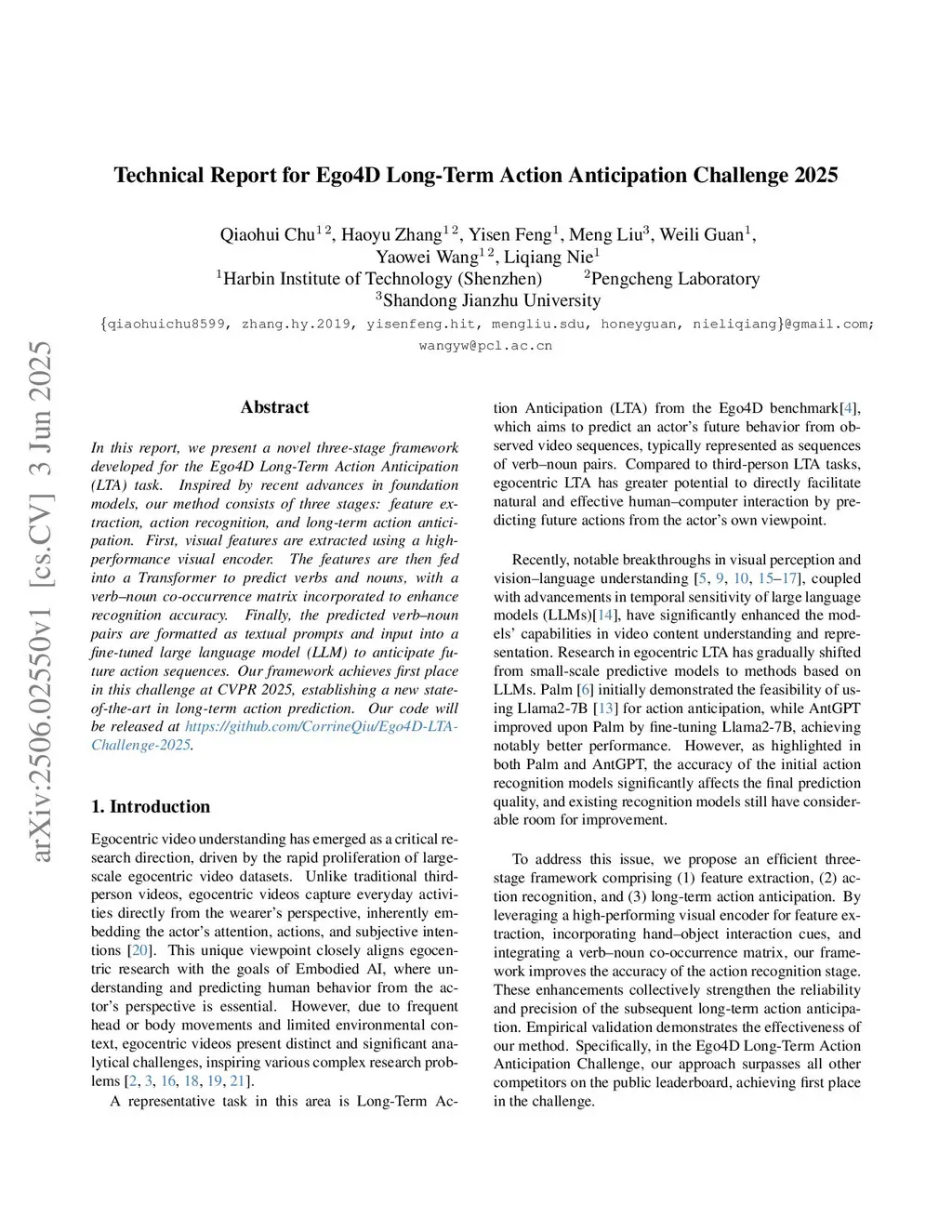 In this report, we present a novel three-stage framework developed for the Ego4D Long-Term Action Anticipation (LTA) task. Inspired by recent advances in foundation models, our method consists of three stages: feature extraction, action recognition, and long-term action anticipation. First, visual features are extracted using a high-performance visual encoder. The features are then fed into a Transformer to predict verbs and nouns, with a verb-noun co-occurrence matrix incorporated to enhance recognition accuracy. Finally, the predicted verb-noun pairs are formatted as textual prompts and input into a fine-tuned large language model (LLM) to anticipate future action sequences. Our framework achieves first place in this challenge at CVPR 2025, establishing a new state-of-the-art in long-term action prediction. Our code will be released atthis https URL.