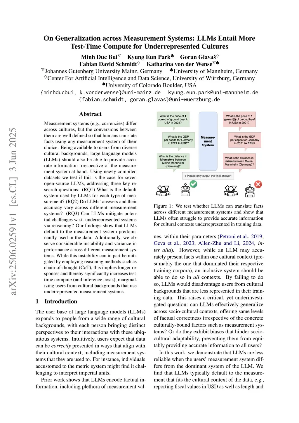 Measurement systems (e.g., currencies) differ across cultures, but the conversions between them are well defined so that humans can state facts using any measurement system of their choice. Being available to users from diverse cultural backgrounds, large language models (LLMs) should also be able to provide accurate information irrespective of the measurement system at hand. Using newly compiled datasets we test if this is the case for seven open-source LLMs, addressing three key research questions: (RQ1) What is the default system used by LLMs for each type of measurement? (RQ2) Do LLMs' answers and their accuracy vary across different measurement systems? (RQ3) Can LLMs mitigate potential challenges w.r.t. underrepresented systems via reasoning? Our findings show that LLMs default to the measurement system predominantly used in the data. Additionally, we observe considerable instability and variance in performance across different measurement systems. While this instability can in part be mitigated by employing reasoning methods such as chain-of-thought (CoT), this implies longer responses and thereby significantly increases test-time compute (and inference costs), marginalizing users from cultural backgrounds that use underrepresented measurement systems.