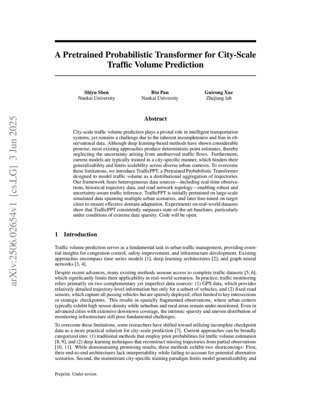 City-scale traffic volume prediction plays a pivotal role in intelligent transportation systems, yet remains a challenge due to the inherent incompleteness and bias in observational data. Although deep learning-based methods have shown considerable promise, most existing approaches produce deterministic point estimates, thereby neglecting the uncertainty arising from unobserved traffic flows. Furthermore, current models are typically trained in a city-specific manner, which hinders their generalizability and limits scalability across diverse urban contexts. To overcome these limitations, we introduce TrafficPPT, a Pretrained Probabilistic Transformer designed to model traffic volume as a distributional aggregation of trajectories. Our framework fuses heterogeneous data sources-including real-time observations, historical trajectory data, and road network topology-enabling robust and uncertainty-aware traffic inference. TrafficPPT is initially pretrained on large-scale simulated data spanning multiple urban scenarios, and later fine-tuned on target cities to ensure effective domain adaptation. Experiments on real-world datasets show that TrafficPPT consistently surpasses state-of-the-art baselines, particularly under conditions of extreme data sparsity. Code will be open.