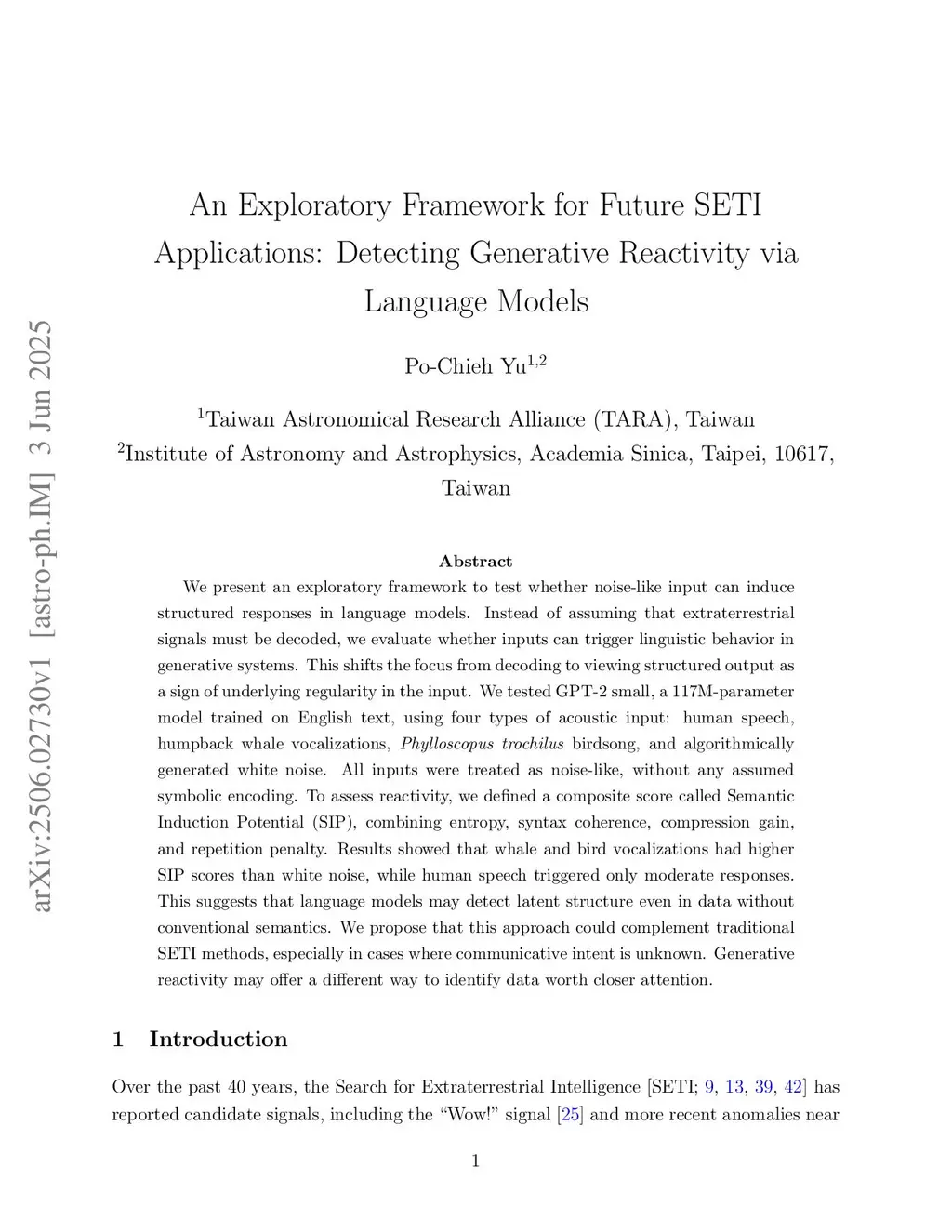 We present an exploratory framework to test whether noise-like input can induce structured responses in language models. Instead of assuming that extraterrestrial signals must be decoded, we evaluate whether inputs can trigger linguistic behavior in generative systems. This shifts the focus from decoding to viewing structured output as a sign of underlying regularity in the input. We tested GPT-2 small, a 117M-parameter model trained on English text, using four types of acoustic input: human speech, humpback whale vocalizations, Phylloscopus trochilus birdsong, and algorithmically generated white noise. All inputs were treated as noise-like, without any assumed symbolic encoding. To assess reactivity, we defined a composite score called Semantic Induction Potential (SIP), combining entropy, syntax coherence, compression gain, and repetition penalty. Results showed that whale and bird vocalizations had higher SIP scores than white noise, while human speech triggered only moderate responses. This suggests that language models may detect latent structure even in data without conventional semantics. We propose that this approach could complement traditional SETI methods, especially in cases where communicative intent is unknown. Generative reactivity may offer a different way to identify data worth closer attention.