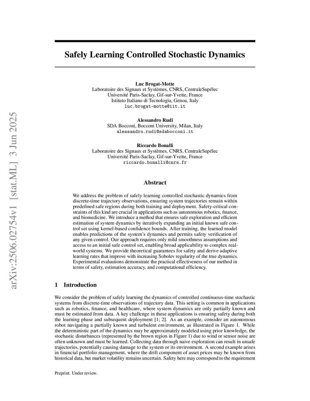 We address the problem of safely learning controlled stochastic dynamics from discrete-time trajectory observations, ensuring system trajectories remain within predefined safe regions during both training and deployment. Safety-critical constraints of this kind are crucial in applications such as autonomous robotics, finance, and biomedicine. We introduce a method that ensures safe exploration and efficient estimation of system dynamics by iteratively expanding an initial known safe control set using kernel-based confidence bounds. After training, the learned model enables predictions of the system's dynamics and permits safety verification of any given control. Our approach requires only mild smoothness assumptions and access to an initial safe control set, enabling broad applicability to complex real-world systems. We provide theoretical guarantees for safety and derive adaptive learning rates that improve with increasing Sobolev regularity of the true dynamics. Experimental evaluations demonstrate the practical effectiveness of our method in terms of safety, estimation accuracy, and computational efficiency.