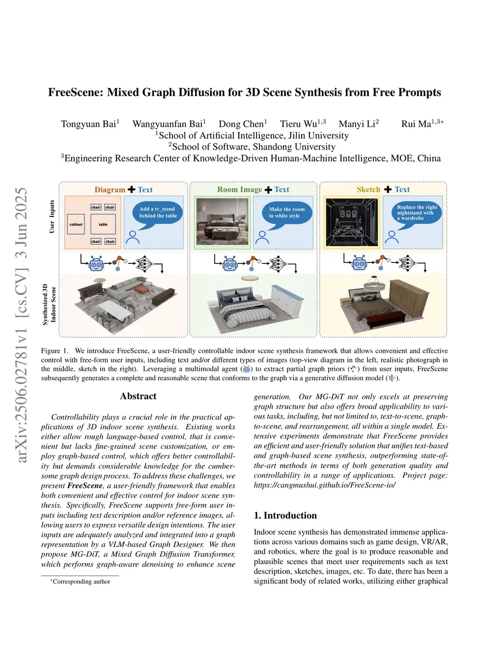 Controllability plays a crucial role in the practical applications of 3D indoor scene synthesis. Existing works either allow rough language-based control, that is convenient but lacks fine-grained scene customization, or employ graph based control, which offers better controllability but demands considerable knowledge for the cumbersome graph design process. To address these challenges, we present FreeScene, a user-friendly framework that enables both convenient and effective control for indoor scenethis http URL, FreeScene supports free-form user inputs including text description and/or reference images, allowing users to express versatile design intentions. The user inputs are adequately analyzed and integrated into a graph representation by a VLM-based Graph Designer. We then propose MG-DiT, a Mixed Graph Diffusion Transformer, which performs graph-aware denoising to enhance scene generation. Our MG-DiT not only excels at preserving graph structure but also offers broad applicability to various tasks, including, but not limited to, text-to-scene, graph-to-scene, and rearrangement, all within a single model. Extensive experiments demonstrate that FreeScene provides an efficient and user-friendly solution that unifies text-based and graph based scene synthesis, outperforming state-of-the-art methods in terms of both generation quality and controllability in a range of applications.