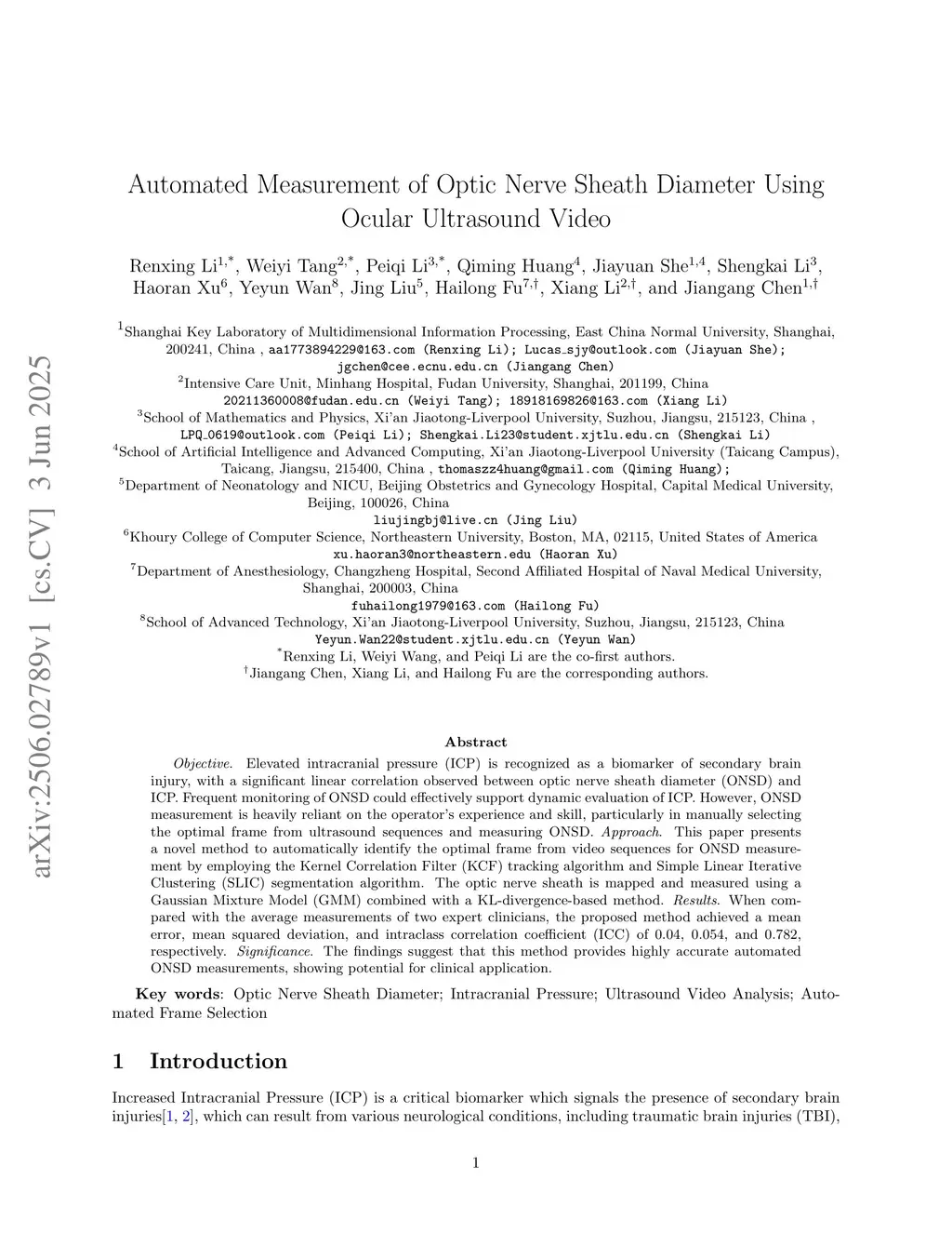 Objective. Elevated intracranial pressure (ICP) is recognized as a biomarker of secondary brain injury, with a significant linear correlation observed between optic nerve sheath diameter (ONSD) and ICP. Frequent monitoring of ONSD could effectively support dynamic evaluation of ICP. However, ONSD measurement is heavily reliant on the operator's experience and skill, particularly in manually selecting the optimal frame from ultrasound sequences and measuring ONSD. Approach. This paper presents a novel method to automatically identify the optimal frame from video sequences for ONSD measurement by employing the Kernel Correlation Filter (KCF) tracking algorithm and Simple Linear Iterative Clustering (SLIC) segmentation algorithm. The optic nerve sheath is mapped and measured using a Gaussian Mixture Model (GMM) combined with a KL-divergence-based method. Results. When compared with the average measurements of two expert clinicians, the proposed method achieved a mean error, mean squared deviation, and intraclass correlation coefficient (ICC) of 0.04, 0.054, and 0.782, respectively. Significance. The findings suggest that this method provides highly accurate automated ONSD measurements, showing potential for clinical application.