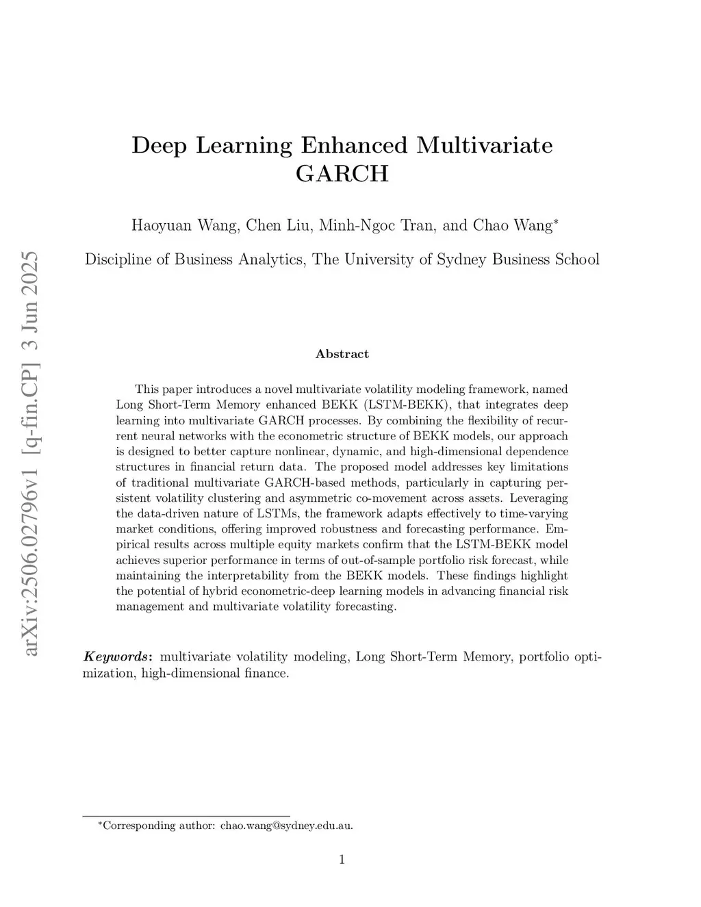 This paper introduces a novel multivariate volatility modeling framework, named Long Short-Term Memory enhanced BEKK (LSTM-BEKK), that integrates deep learning into multivariate GARCH processes. By combining the flexibility of recurrent neural networks with the econometric structure of BEKK models, our approach is designed to better capture nonlinear, dynamic, and high-dimensional dependence structures in financial return data. The proposed model addresses key limitations of traditional multivariate GARCH-based methods, particularly in capturing persistent volatility clustering and asymmetric co-movement across assets. Leveraging the data-driven nature of LSTMs, the framework adapts effectively to time-varying market conditions, offering improved robustness and forecasting performance. Empirical results across multiple equity markets confirm that the LSTM-BEKK model achieves superior performance in terms of out-of-sample portfolio risk forecast, while maintaining the interpretability from the BEKK models. These findings highlight the potential of hybrid econometric-deep learning models in advancing financial risk management and multivariate volatility forecasting.
